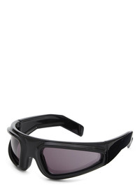 RICK OWENS RYDER SUNGLASSES THESE RYDER SUNGLASSES ARE A PAIR OF WRAP-AROUND FRAMES WITH AN EMPHASIS ON PERIPHERAL SIGHT. THEY FEATURE A BOLD STRAIGHT EYEBROW RIDGE, WITH DEEP SET LENSES EDGED WITH A THICK PROTRUDING FRAME AND RICK OWENS SIGNATURE THICK ANGLED ARMS WITH LOGO ON INSIDE RIGHT NOT SUITABLE FOR CONVERSION INTO PRESCRIPTION GLASSES - COLOR: BLK TEMPLE/BLK LENS - MATERIAL: FRAME 100% NYLON - LENSES 100% NYLON