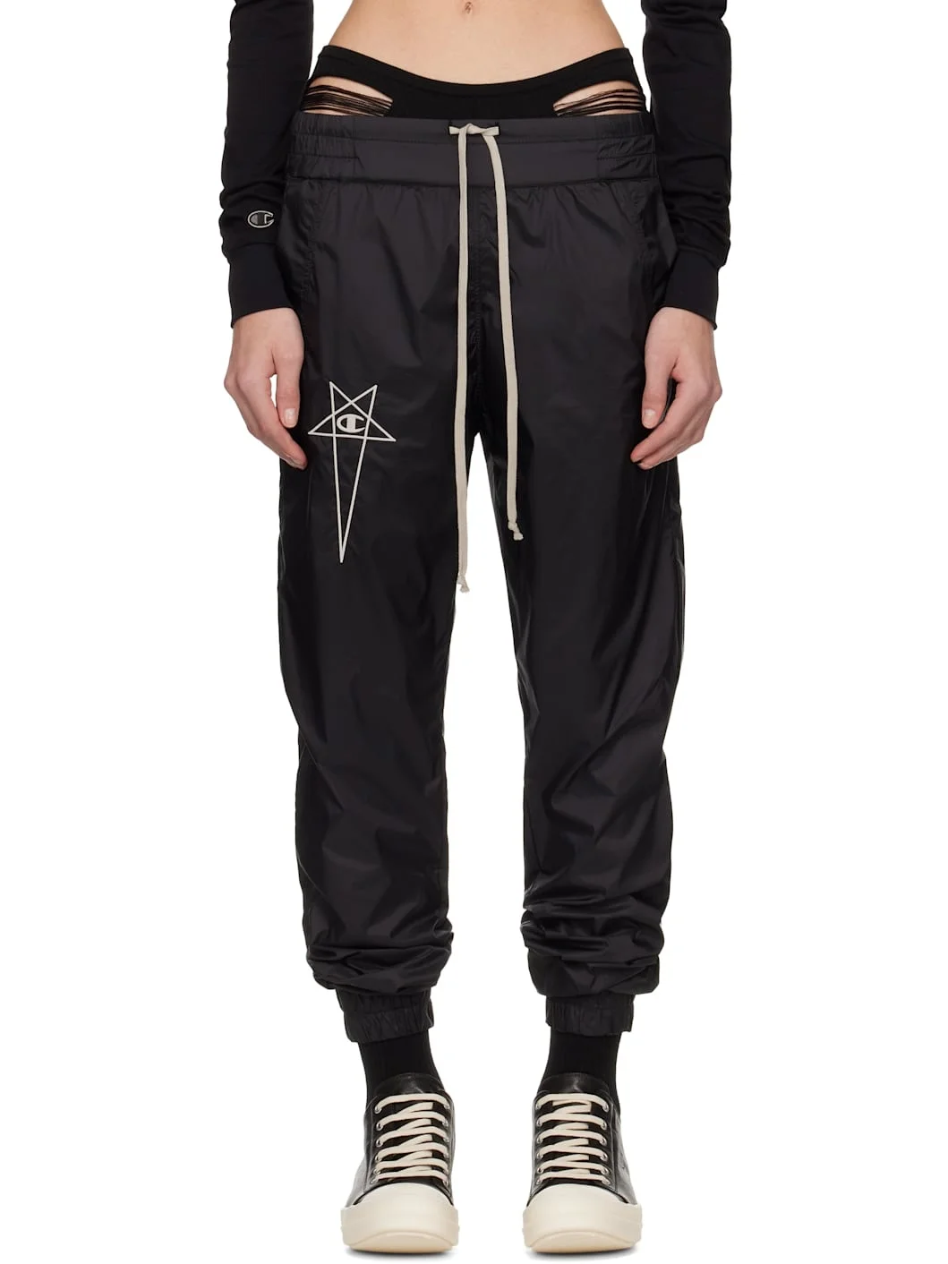 GRS-certified recycled nylon taffeta sweatpants. · Drawstring at elasticized waistband · Four-pocket styling · Logo embroidered at front · Elasticized cuffs · Embroidered logo patch at back Part of the Rick Owens x Champion collaboration. Supplier color: Black 100% recycled polyamide. Made in Italy 252232F086002