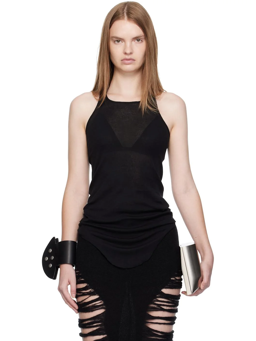 Semi-sheer organic cotton jersey tank top. · GOTS-certified organic cotton · Scoop neck · Raw edge at curved hem · Racer back · Central seam at back Supplier color: Black 100% organic cotton. Made in Italy 252232F111009