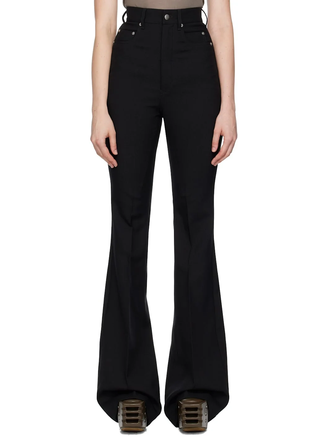 Virgin wool grain de poudre trousers. · RWS-certified virgin wool · Flared, slim-fit · High-rise · Belt loops · Six-pocket styling · Zip fly · Creased legs · Dart at inseams · Logo-engraved silver-tone hardware Supplier color: Black 100% virgin wool. Made in Italy 252232F087013