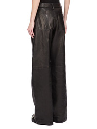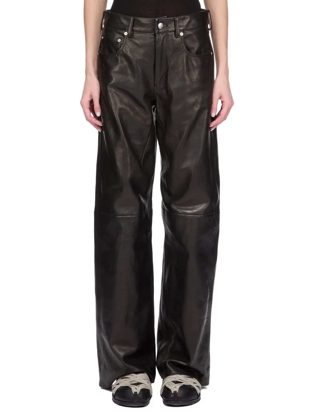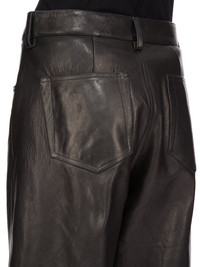 RICK OWENS FW25 CONCORDIANS GETH JEANS IN IN BLACK VEG NAPPA LAMB THESE GETH JEANS ARE A FULL LENGTH 5 POCKET JEAN WITH A LOW-RISE AND WIDE FIT. THEY HAVE A SILVER BUTTON FLY, BELT LOOPS AND POCKET RIVETS THIS MEDIUMWEIGHT LAMB LEATHER IS VEG TANNED AND FINISHED USING NATURAL WAXES AND ANILINE WHICH MAKES A SUPPLE HANDFEEL. BECAUSE THIS SKIN IS NAKED, NOT FINISHED USING ANY PIGMENTS COVERING THE SKIN, NATURAL MARKINGS AND SHADINGS ARE VISIBLE WHICH MAKES EACH SKIN AND PRODUCT UNIQUE VEG TANNING MEANS ONLY VEGETAL AND NATURAL TANNINS WERE USED IN THE PROCESS OF TANNING AND PRESERVING THIS LEATHER COLOR: BLACK MATERIAL: 100% LAMB LEATHER MODEL IS 181CM TALL MODEL WEARS SIZE 38