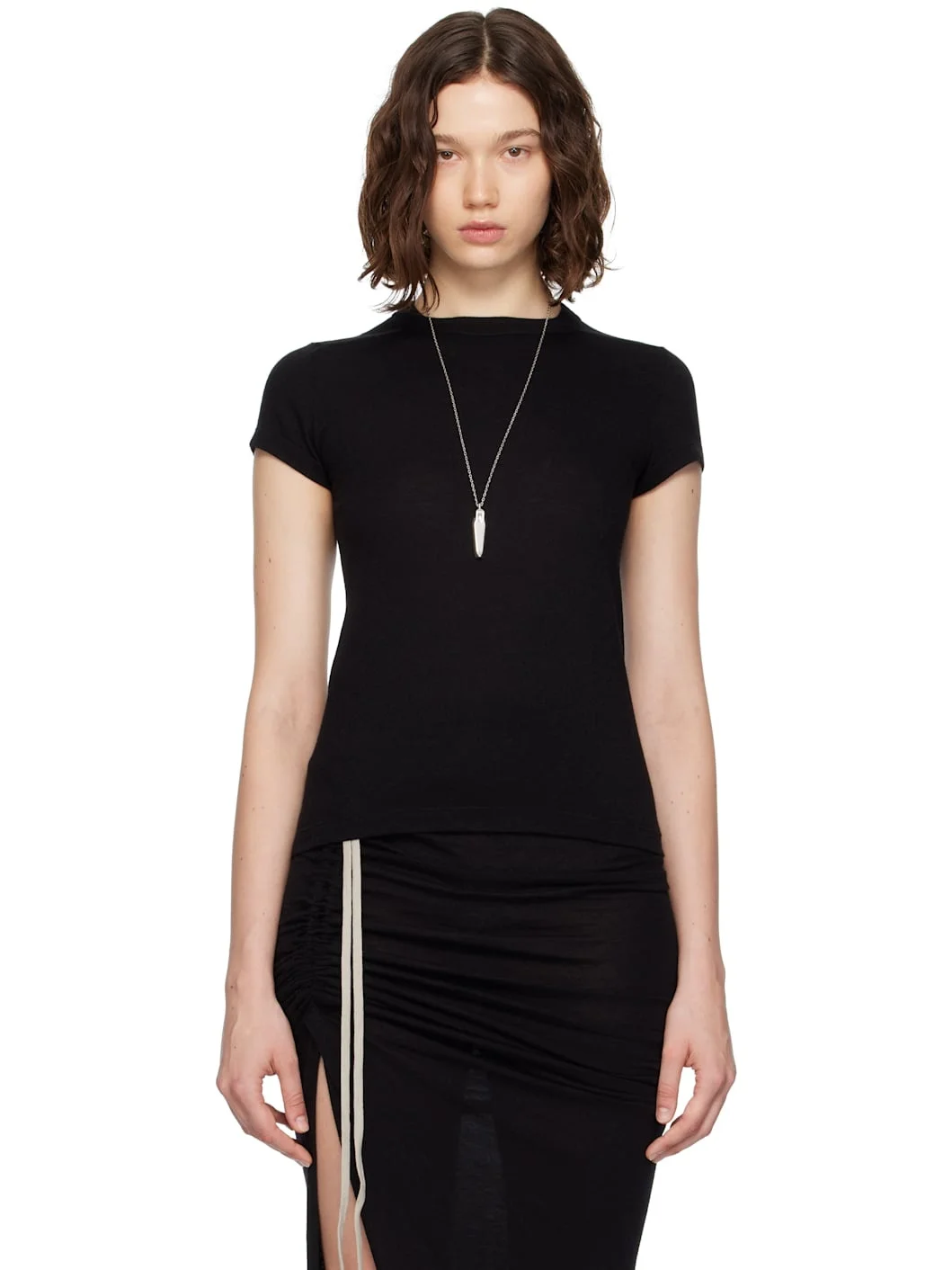 Viscose- and angora wool-blend jersey T-shirt. · Rib-knit crewneck · Cap sleeves · Central seam at back Supplier color: Black 30% nylon, 30% viscose, 20% angora wool, 20% wool. Made in Italy 252232F110020