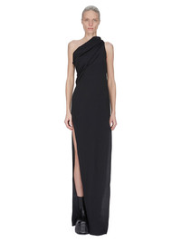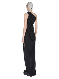 RICK OWENS SS25 HOLLYWOOD ATHENA ARROWHEAD IN BLACK COCOON CREPE THIS ATHENA ARROWHEAD IS FLOOR-LENGTH. IT HAS ONE RIGHT SHOULDER WITH AN ASYMMETRICAL NECKLINE THAT DRAPES ACROSS THE BODY. IT FEATURES A SKIRT WITH TWO HIGH SIDE SLITS WHICH TAPERS SLIGHTLY TO THE FLOOR WITH A CENTER BACK SEAM THIS LIGHTWEIGHT AND FLUID SILK BLEND CREPE HAS A DRY AND MATTE FINISH. THIS FABRIC IS MADE FROM FSC® CERTIFIED ACETATE WHICH ENSURES THAT THE FIBERS ARE PRODUCED FROM RESPONSIBLY MANAGED SOURCES AND NO DEFORESTATION OCCURS COLOR: BLACK MATERIAL: 64% ACETATE + 36% ACETATE MODEL IS 181CM TALL MODEL WEARS SIZE 40