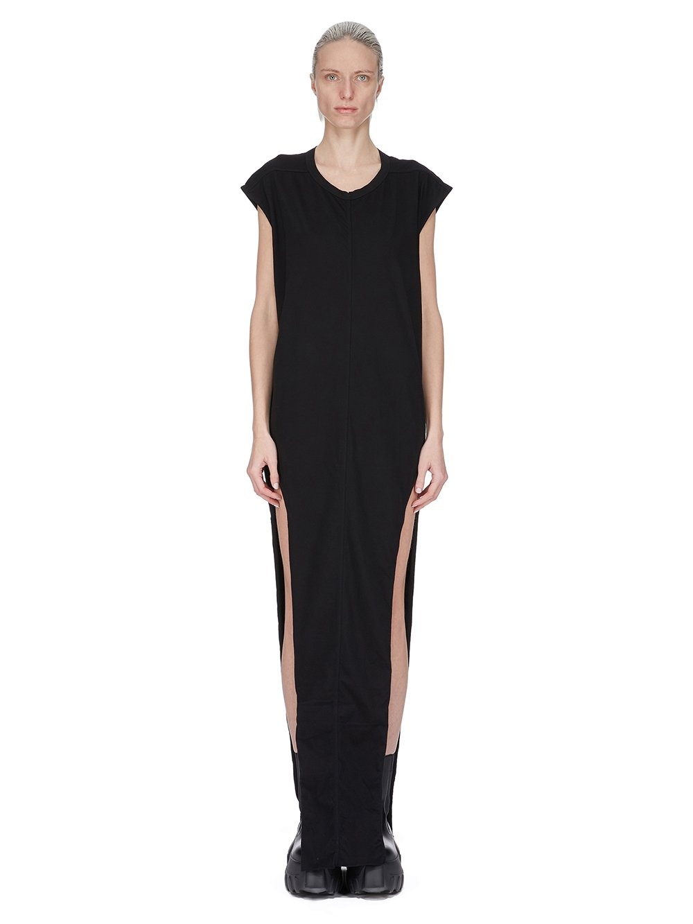 RICK OWENS SS25 HOLLYWOOD ARROWHEAD GOWN IN BLACK CLASSIC COTTON JERSEY THIS ARROWHEAD GOWN IS FLOOR-LENGTH WITH A LOOSE FIT. IT HAS A ROUND RIBBED CREWNECK, LEVEL SHOULDER SEAMS AND WIDE SHOULDERS THAT CREATE SLIGHT CAP SLEEVES. IT FEATURES A SKIRT WITH TWO HIGH SIDE SLITS THAT TAPERS SLIGHTLY TO THE FLOOR THIS MEDIUMWEIGHT CLASSIC COTTON JERSEY IS COMPACT WITH A DRY HANDFEEL. THIS JERSEY IS MADE USING GOTS CERTIFIED ORGANIC COTTON WHICH MEANS THE NATURAL FIBER IS GROWN WITHOUT HARMFUL CHEMICALS, LEAVING OUR SOIL, AIR AND WATER CLEANER FROM CONTAMINATES WE STRIVE TO KEEP OUR PRODUCTION AS LOCAL AS POSSIBLE. THE FULL MANUFACTURING CYCLE OF THIS PRODUCT, FROM THE MATERIAL KNITTING TO SEWING AND FINISHING, WAS UNDERTAKEN CLOSE TO OUR HOME BASE IN CONCORDIA, ITALY. COLOR: BLACK MATERIAL: 100% COTTON MODEL IS 181CM TALL MODEL WEARS SIZE 40
