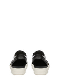 RICK OWENS SS25 HOLLYWOOD PRECOLLECTION HOLLOWED VINTAGE SNEAKS IN BLACK/MILK FULL GRAIN CALF LEATHER THESE HOLLOWED VINTAGE SNEAKS ARE BELOW-ANKLE HEIGHT. THEY FEATURE CUT-OUTS ON THE SIDE, BACK AND FRONT TOE, CREATING A CAGE LIKE SANDAL. THEY HAVE EIGHT EYELETS, LACES, A PADDED ANKLE, CONTRAST TOP STITCHING AND SHARK-TOOTHED BUMPER SOLES THIS MEDIUMWEIGHT FULL GRAIN CALF LEATHER HAS A FLAT AND MATTE SURFACE FINISH AND IS SPECIFICALLY TANNED FOR SHOES WITH AN ABRASION-RESISTANT FINISHTHIS TANNERY IS LWG CERTIFIED WITH A BRONZE RATING COLOR: BLACK/MILK/MILK MATERIAL: UPPER 100% COW LEATHERTOE 100% CALF LEATHERLINING 100% CALF LEATHER INSOLE 100% CALF LEATHERSOLE 100% THERMOPLASTIC RUBBER