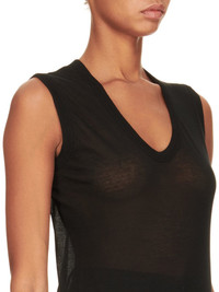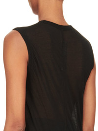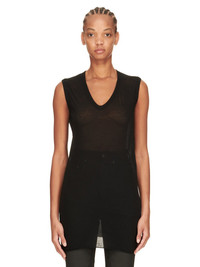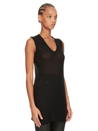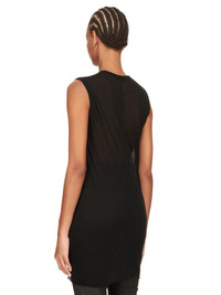 RICK OWENS SS25 HOLLYWOOD V NECK SL T IN BLACK UNSTABLE COTTON THIS V NECK SL T IS BELOW HIP LENGTH AND SLEEVELESS WITH A SOFT V NECK AND A RAW CUT HEM. IT FEATURES THE SIGNATURE SINGLE SEAM RUNNING DOWN THE CENTRE BACK SPINE THIS LIGHTWEIGHT COTTON JERSEY IS SEMI-TRANSPARENT WITH A SOFT HANDFEEL. THIS JERSEY IS MADE USING GOTS CERTIFIED ORGANIC COTTON WHICH MEANS THE NATURAL FIBER IS GROWN WITHOUT HARMFUL CHEMICALS, LEAVING OUR SOIL, AIR AND WATER CLEANER FROM CONTAMINATES WE STRIVE TO KEEP OUR PRODUCTION AS LOCAL AS POSSIBLE. THE FULL MANUFACTURING CYCLE OF THIS PRODUCT, FROM THE MATERIAL KNITTING TO SEWING AND FINISHING, WAS UNDERTAKEN CLOSE TO OUR HOME BASE IN CONCORDIA, ITALY COLOR: BLACK MATERIAL: 100% COTTON MODEL IS 181CM TALL MODEL WEARS SIZE 48