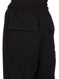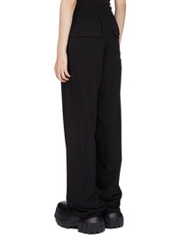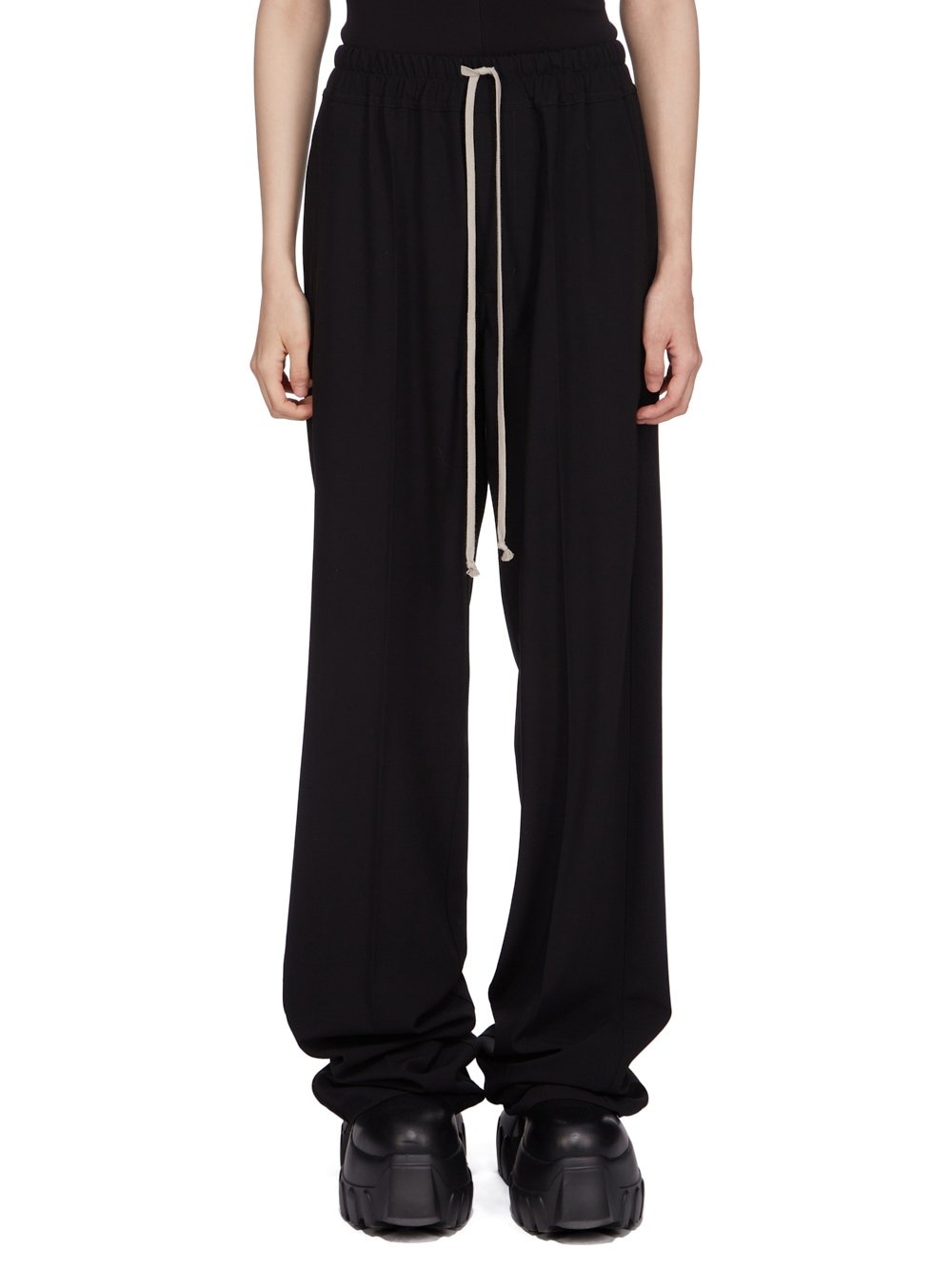 RICK OWENS SS25 HOLLYWOOD DIETRICH DRAWSTRING IN BLACK LIGHT POUDRE THESE DIETRICH DRAWSTRINGS ARE FULL-LENGTH, WITH A LOOSE, STRAIGHT LEG. THEY HAVE AN ELASTICIZED WAISTBAND WITH DRAWSTRING, AND A STITCHED FLY. THEY HAVE SIDE SEAM POCKETS AND TWO REAR SQUARE PATCH POCKETS WITH FLAPS THIS MEDIUMWEIGHT GRAIN DE POUDRE WOOL IS MATTE AND HAS A SOFT AND FLUID HAND FEEL. COLOR: BLACK MATERIAL: 100% WOOL BUTTONS 100% BUFFALO HORN MODEL IS 181CM TALL MODEL WEARS SIZE 40