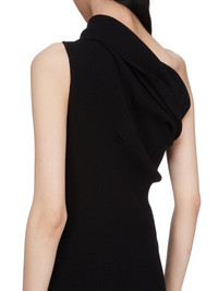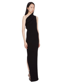 RICK OWENS SS25 HOLLYWOOD THENA DRESS IN BLACK RIBBED KNIT THIS ATHENA DRESS IS ANKLE LENGTH WITH A CLOSE TO THE BODY FIT. IT IS SLEEVELESS AND HAS AN ASYMMETRICAL DRAPED NECKLINE AND ONE LEFT SHOULDER THAT CREATES A SLIGHT DRAPING ACROSS THE FRONT AND BACK. IT FEATURES A SPLIT ON THE RIGHT SIDE, TO ABOVE THE KNEE, AND A SIGNATURE KNIT LINE RUNNING DOWN THE CENTER BACK SPINE THIS MEDIUMWEIGHT VISCOSE RIB KNIT IS STRETCHY WITH A DRY HANDFEEL. COLOR: BLACK MATERIAL: 68% VISCOSE + 32% POLYESTER MODEL IS 181CM TALL MODEL WEARS SIZE S