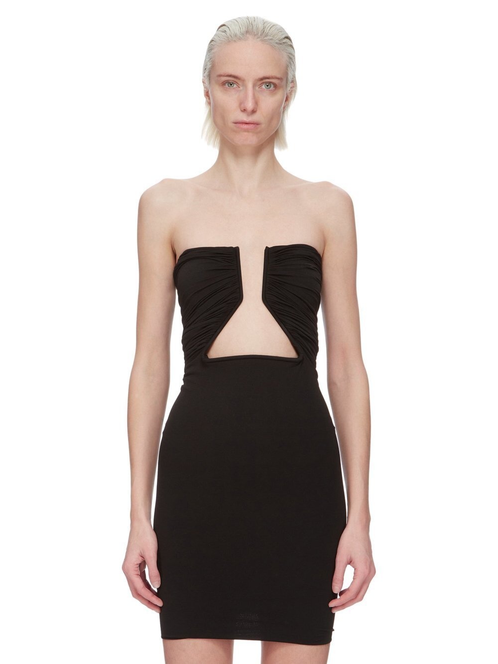 RICK OWENS SS25 HOLLYWOOD JERSEY PRONG MINI IN BLACK NYLON STRETCH JERSEY THIS JERSEY PRONG MINI IS MID-THIGH LENGTH. IT FEATURES A STRAPLESS RUCHED BODY GATHERING INTO THE BUST, WHICH FEATURES A BONED GEOMETRIC CUT OUT FRONT AND A TIGHT FITTING SKIRT THIS LIGHTWEIGHT AND STRETCHY NYLON JERSEY HAS A MATTE SURFACE AND A SOFT HANDFEEL. THIS JERSEY IS MADE USING GRS CERTIFIED RECYCLED POLYAMIDE WHICH ENSURES A REDUCTION IN WATER CONSUMPTION, EMISSIONS AND HAZARDOUS WASTE, LESSENING THE DEPENDENCE ON NON-RENEWABLE RESOURCES COLOR: BLACK MATERIAL: 91% NYLON + 9% ELASTANE MODEL IS 181CM TALL MODEL WEARS SIZE 38