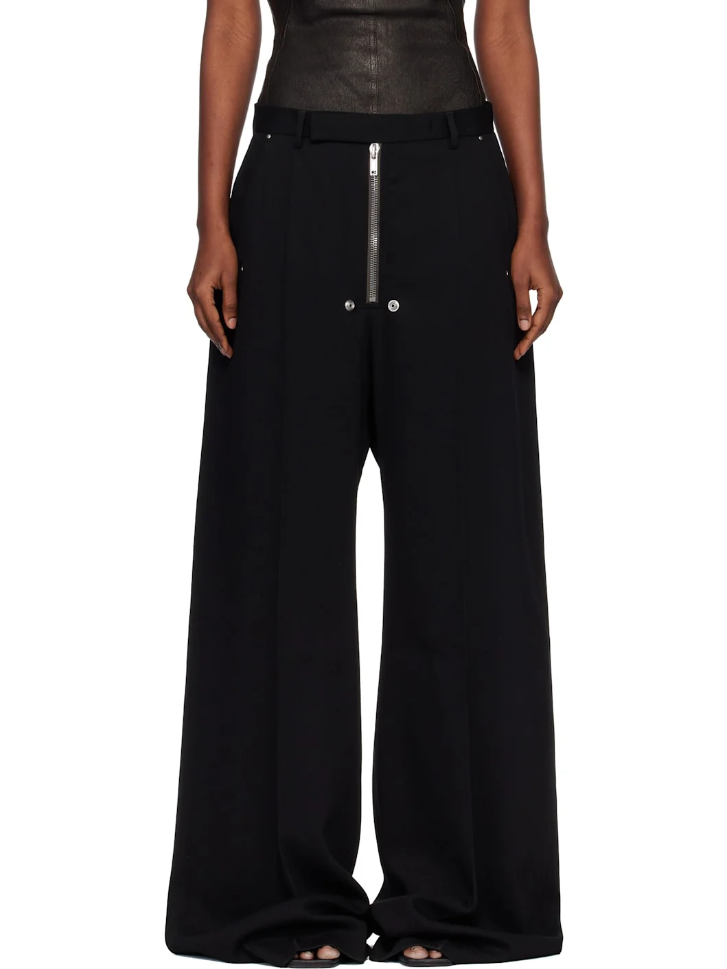 Wool crepe trousers. · Wide-leg · Belt loops · Four-pocket styling · Exposed zip fly · Rivets, grommets, and press-stud hardware at front · Creased legs Supplier color: Black Body: 100% wool. Trim: 100% cupro. Made in Italy 261232F087016