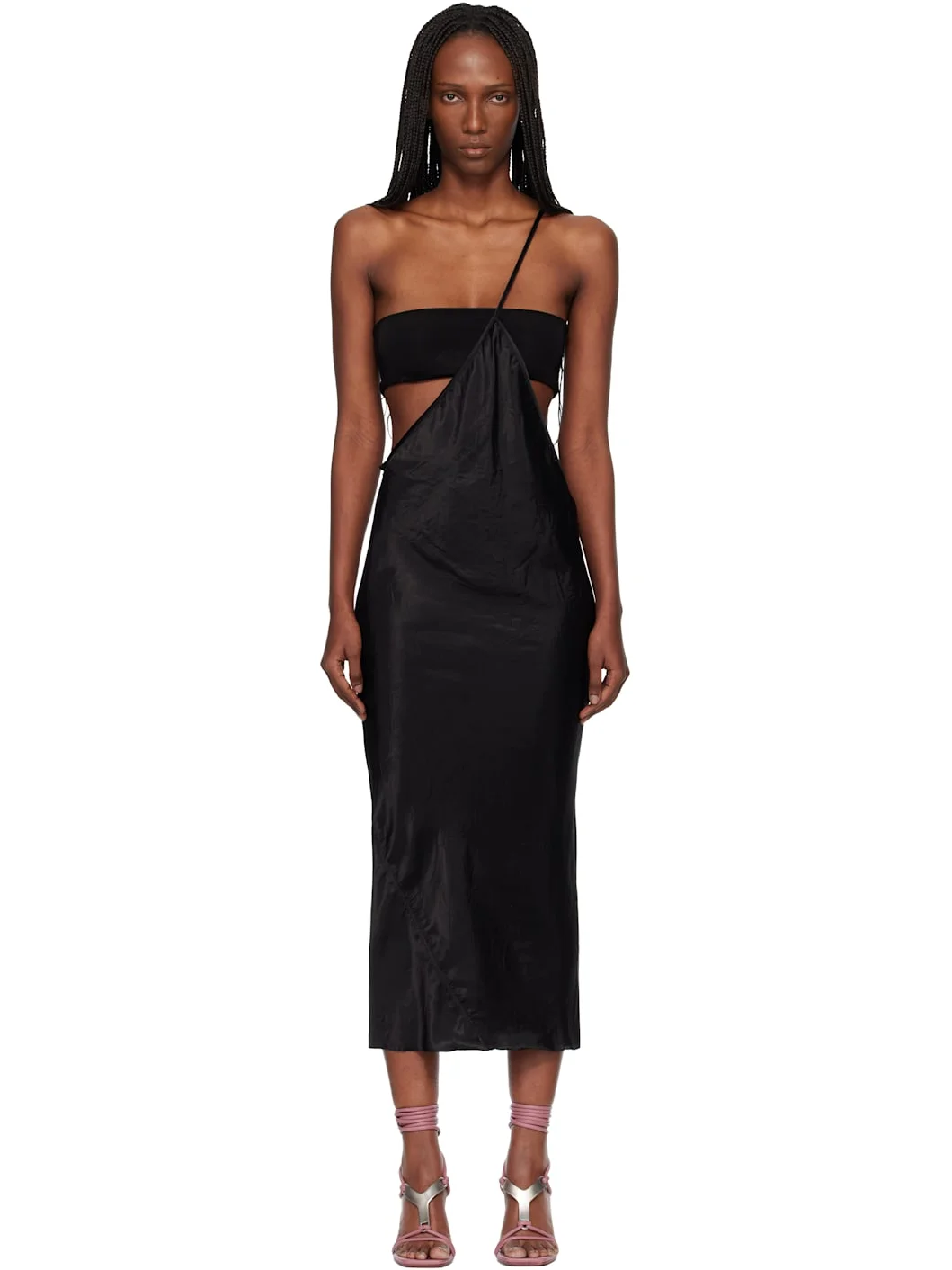 Cupro satin midi dress. · Single-shoulder construction · Raw edge at hem Supplier color: Black 100% cupro. Made in Italy 261232F054023