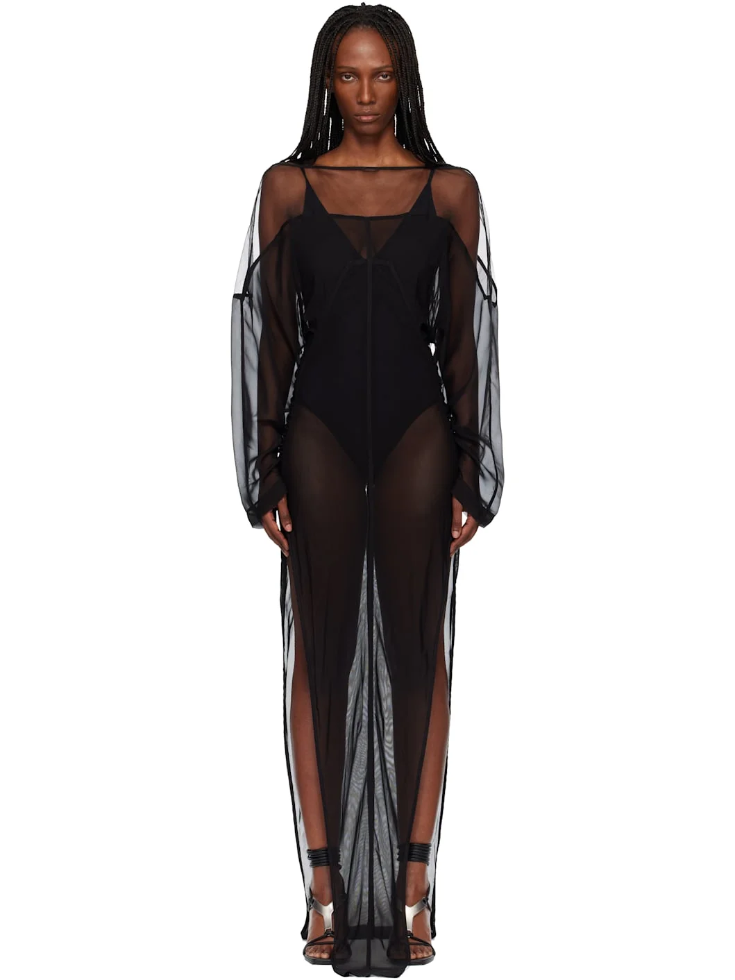 Sheer stretch nylon mesh, nylon tulle, and silk chiffon maxi dress. · Paneled construction · Boatneck · Slit at side seams · Gathering at side seams and back · Yoke sleeves · Button fastening at back collar Supplier color: Black Body 1: 93% nylon, 7% elastane. Body 2: 100% silk. Body 3: 100% nylon. Made in Italy 261232F055007
