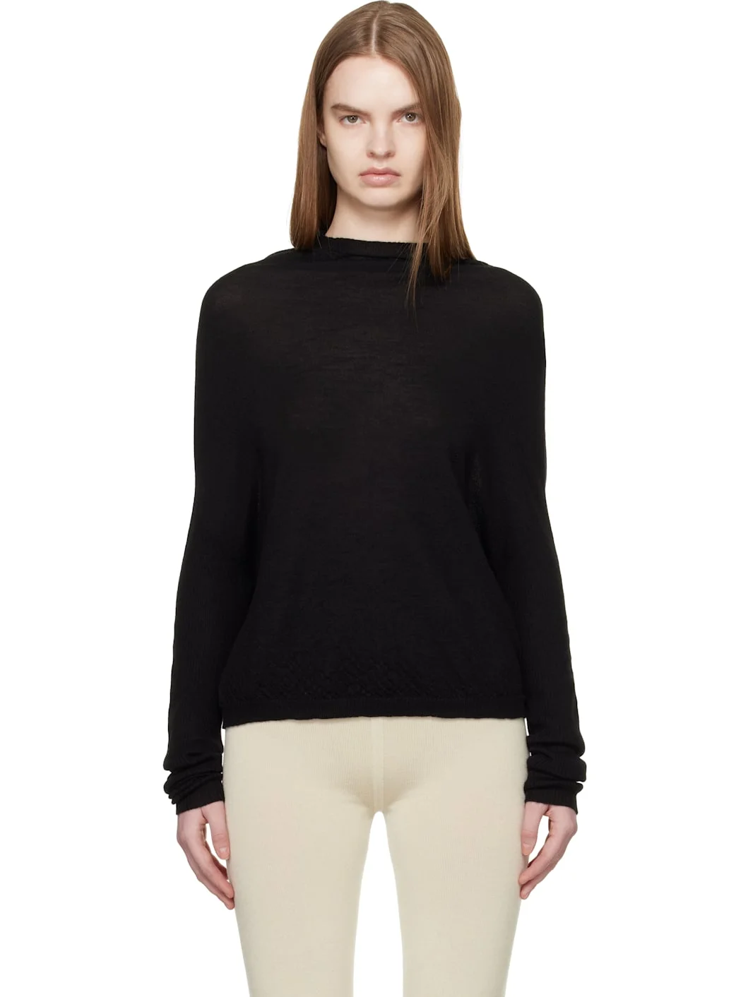 Lightweight knit cashmere sweater. · Rib-knit mock neck, hem, and sleeves · Dropped shoulders · Central garter-stitch stripe at back Supplier color: Black 100% cashmere. Made in Italy 261232F096018