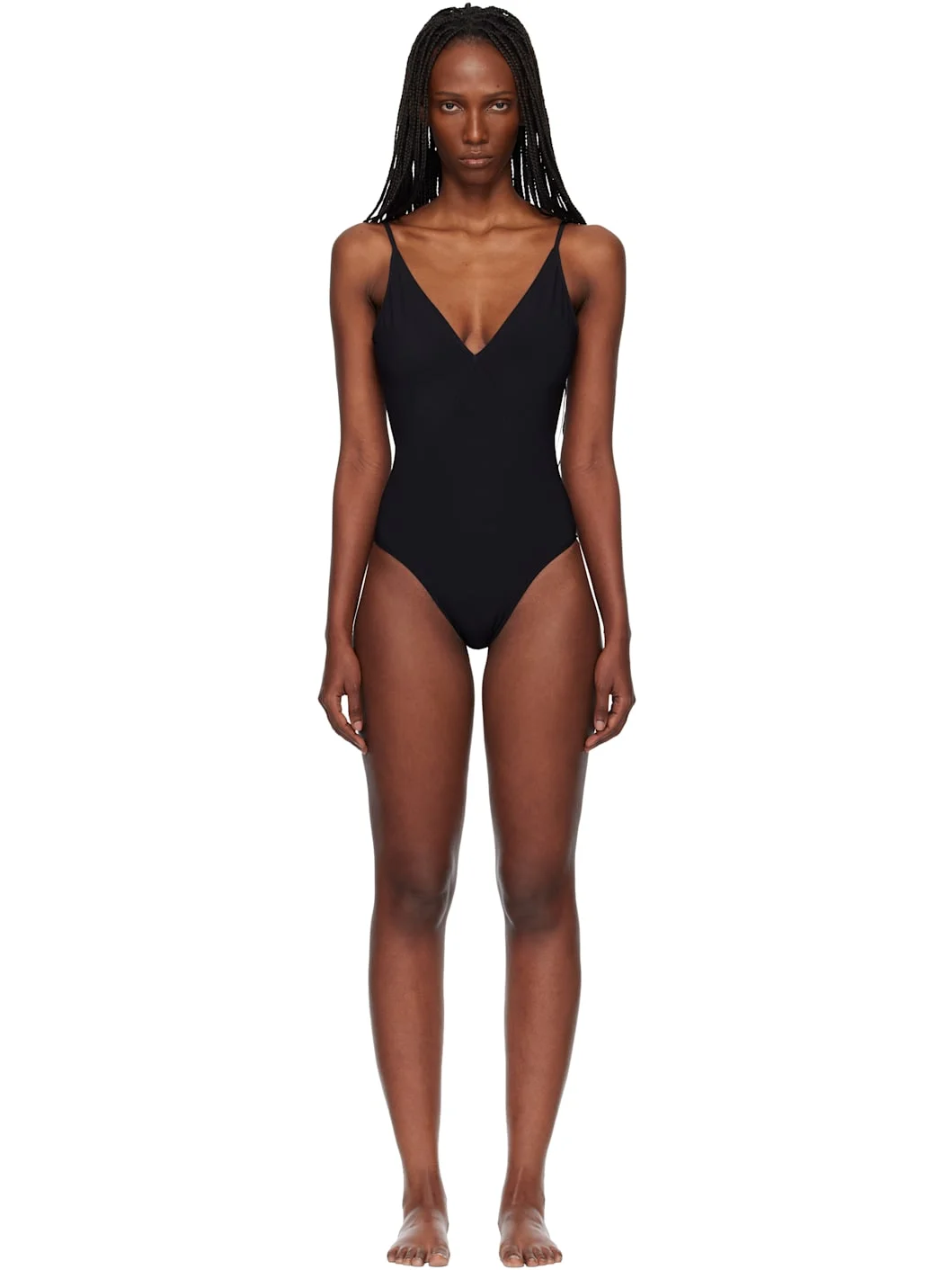 Stretch ECONYL® recycled nylon jersey one-piece swimsuit. · Plunging V-neck · Fixed spaghetti straps · Low back Supplier color: Black 79% recycled nylon, 21% elastane. Made in Italy 261232F103000