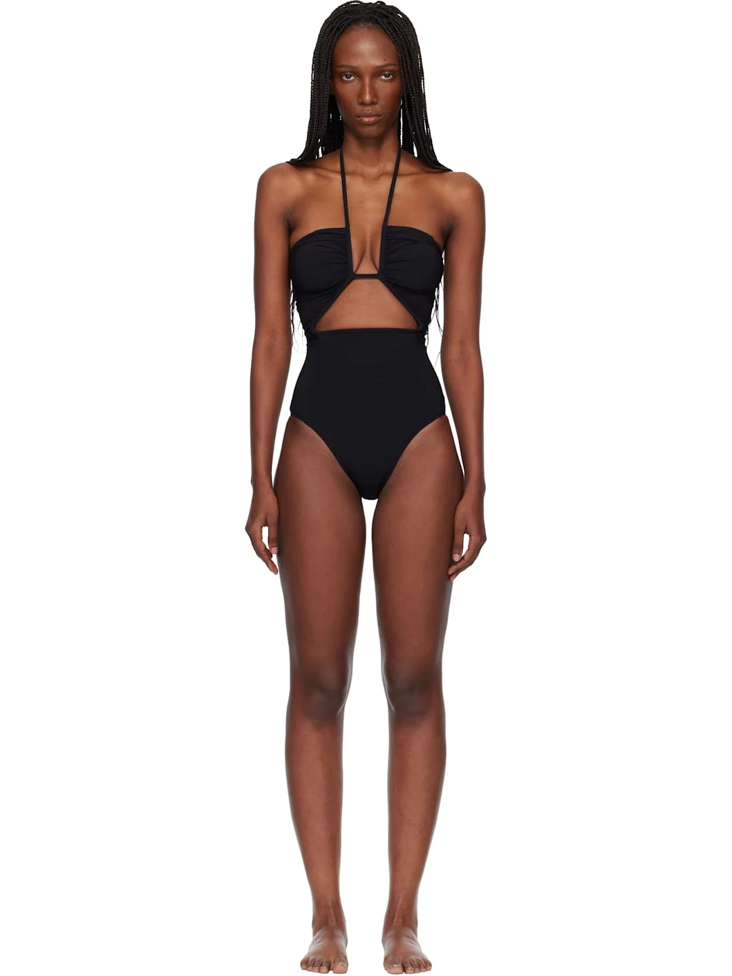 Stretch ECONYL® recycled nylon jersey one-piece swimsuit. · Self-tie halter strap · Ruching at bust · Cutout with boning at front Supplier color: Black 79% recycled nylon, 21% elastane. Made in Italy 261232F103002