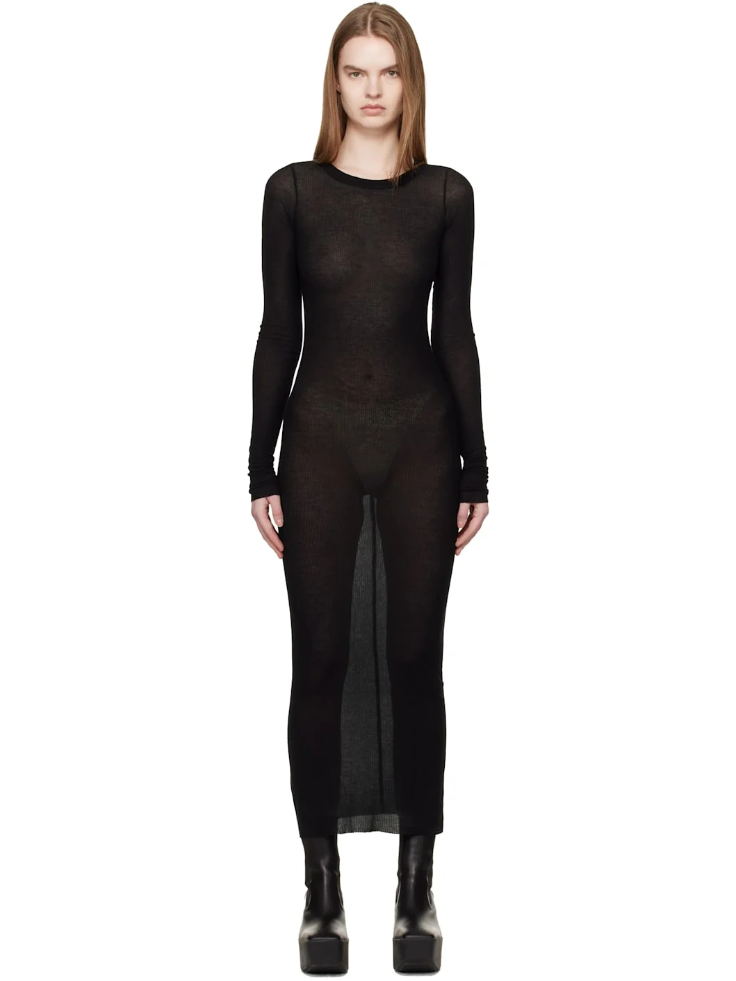 Semi-sheer rib-knit viscose-blend midi dress. · FSC-certified viscose · Crewneck · Raw edge at hem and cuffs Supplier color: Black 88% viscose, 12% silk. Made in Italy 261232F054014