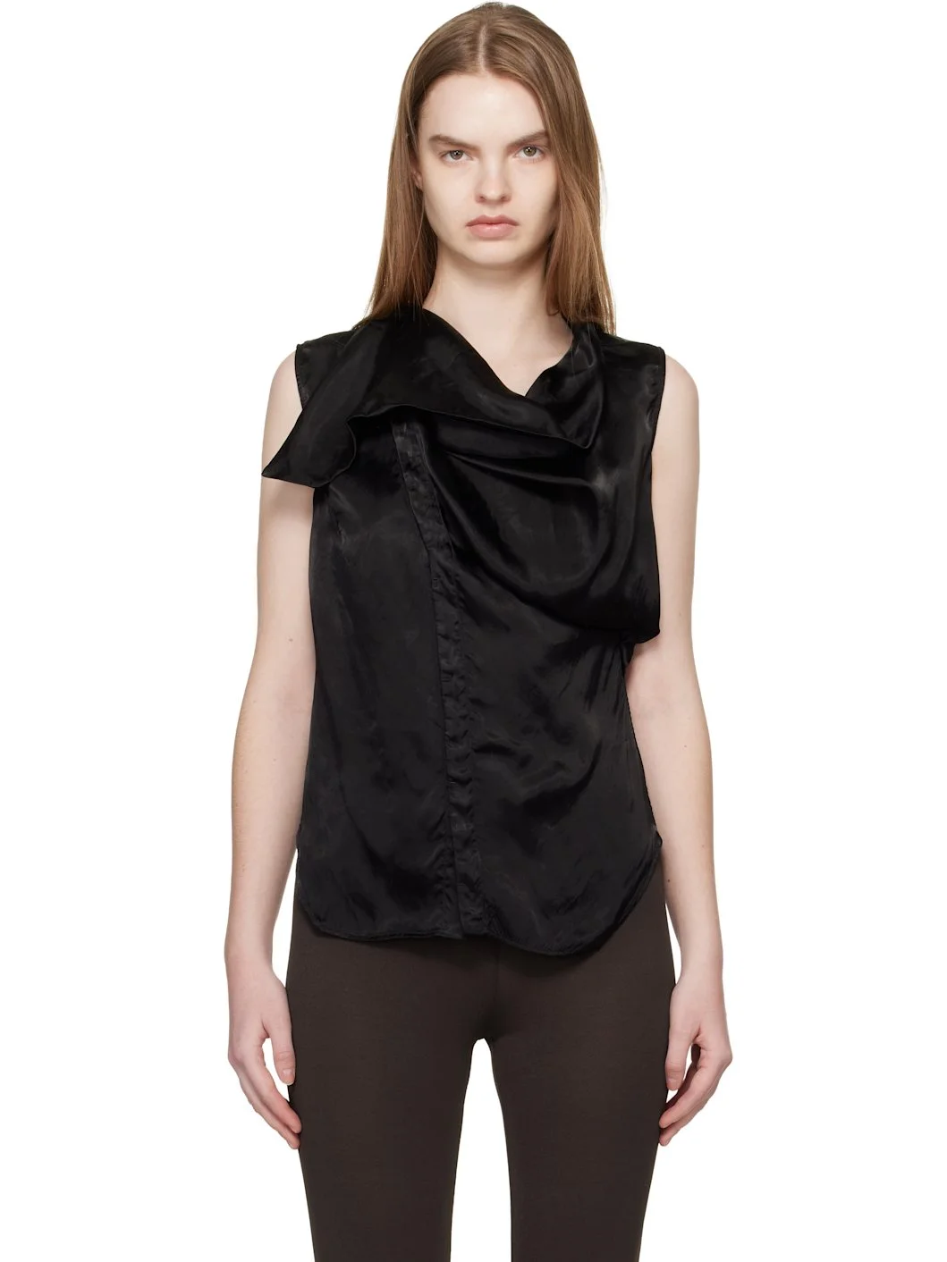 Crinkled cupro satin blouse. · Draped construction · Cowl neck · Offset button closure · Shirttail hem · Extended trim at shoulder · Horn hardware Supplier color: Black 100% cupro. Made in Italy 261232F107003