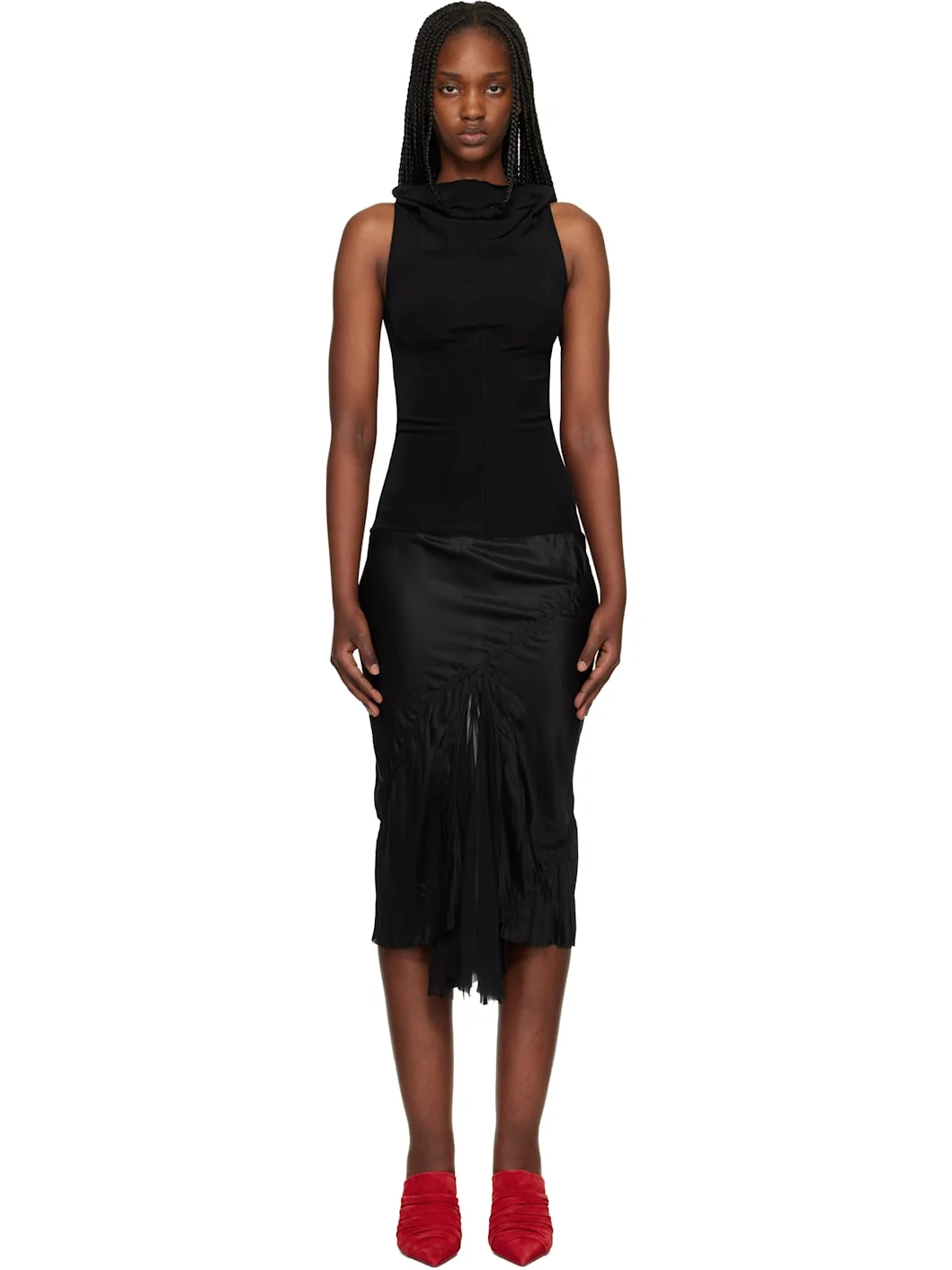 Stretch viscose jersey and cupro satin midi dress. · FSC®-certified viscose · Cowl neck · Central seam at front and back · Paneled construction at skirt · Silk chiffon godet panels at hem · Fixed shoulder straps Supplier color: Black Body 1: 96% viscose, 4% elastane. Body 2: 100% cupro. Trim: 100% silk. Made in Italy 261232F054006