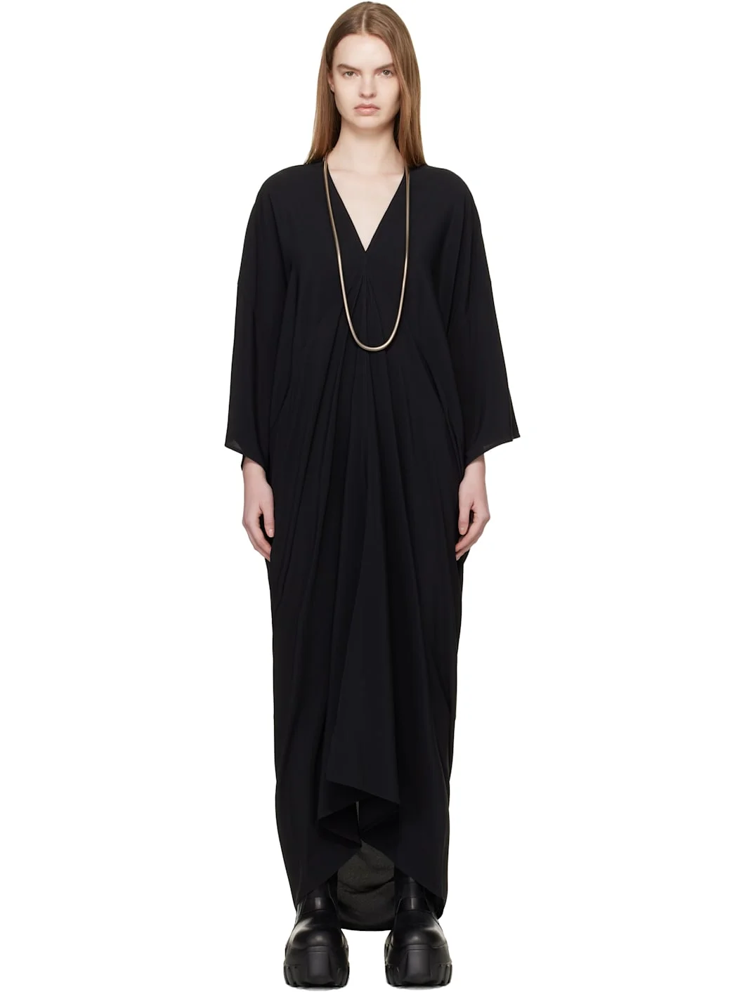 Silk-blend crepe maxi dress. · Plunging V-neck · Draping at chest · Dropped shoulders Supplier color: Black 64% acetate, 36% silk. Made in Italy 261232F055022