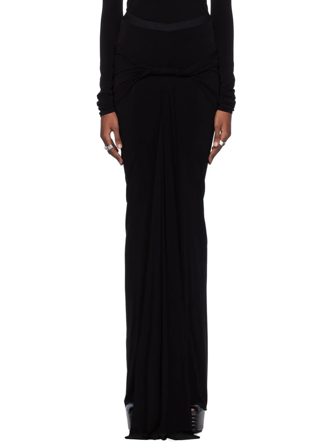 Stretch cupro jersey skirt. Draping throughout. · Elasticized waistband · Twisted detailing at front · Godet panel at hem Supplier color: Black 96% cupro, 4% elastane. Made in Italy 241232F093017