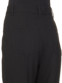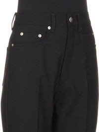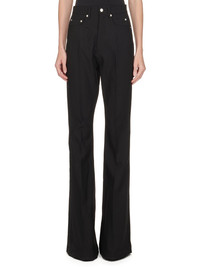 RICK OWENS FW24 PORTERVILLE BOLAN BOOTCUT IN BLACK GRAIN DE POUDRE THIS BOLAN BOOTCUT IS A HIGH WAISTED, SLIM FIT 5 POCKET JEAN WITH A FLOOR-LENGTH BOOT CUT. THEY CLOSE WITH A WAIST BUTTON AND CONCEALED BUTTON FLY. THEY HAVE A WAISTBAND WITH BELT LOOPS AND POCKET RIVETS AND BACK PATCH POCKETS WITH TOPSTITCHING THIS MEDIUMWEIGHT WOOL GRAIN DE POUDRE FABRIC HAS A ROUND AND SOFT HANDFEEL.THIS FABRIC IS MADE FROM RWS CERTIFIED VIRGIN WOOL WHICH ENSURES A HIGH STANDARD IN ANIMAL WELFARE, ENVIRONMENTAL SUSTAINABILITY AND SOCIAL RESPONSIBILITY. EACH BALE OF WOOL IS TRACEABLE BACK TO ITS SOURCE. - COLOR: BLACK - MATERIAL: 100% NEW WOOL - MODEL IS 181CM TALL - MODEL WEARS SIZE 26