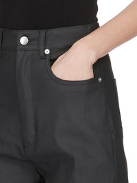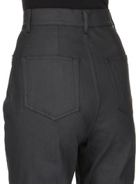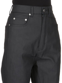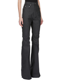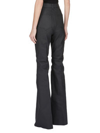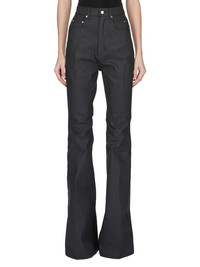 RICK OWENS FW24 PORTERVILLE BOLAN BOOTCUT IN BLACK CHALK STRETCH DENIM THIS BOLAN BOOTCUT IS A HIGH WAISTED, SLIM FIT 6 POCKET JEAN WITH A FLOOR-LENGTH BOOT CUT. THEY CLOSE WITH A WAIST BUTTON AND CONCEALED BUTTON FLY. THEY HAVE A WAISTBAND WITH BELT LOOPS AND POCKET RIVETS AND BACK PATCH POCKETS WITH TOPSTITCHING. THIS VERSION FEATURES THE PORTERVILLE CURVED LOGO EMBROIDERED ON THE FRONT THIS LIGHTWEIGHT STRETCH DENIM IS COVERED WITH A MATTE AND DRY CHALK COATING. THE INDIGO COLOR AND STRUCTURE OF THE DENIM SHINES THROUGH THE COLOR OF THE COATING CREATING A MULTILAYERED AND IRREGULAR COLORATION. THE NATURAL ASPECTS OF THIS FABRIC MEANS THE COATING HAS PEELED OFF IN CERTAIN AREAS, EXPOSING THE UNDERLAYING MATERIAL AND WILL CONTINUE TO DO SO WITH WEAR AND ABRASION. THIS IS AN INHERENT CHARACTERISTIC OF THIS TYPE OF TREATMENT AND IS A DESIRED A VISUAL ASPECT WHICH ADDS TO THE UNIQUENESS OF EACH PIECE AND SHOULD NOT BE CONSIDERED A DEFECT COLOR: BLACK MATERIAL: 91% COTTON + 6% ELASTOMULTIESTER + 3% RUBBER MODEL IS 181CM TALL MODEL WEARS SIZE 38