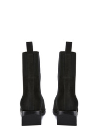 RICK OWENS FW25 CONCORDIANS HEELED SLIVER BOOTS IN BLACK NUBUCK THESE HEELED SLIVER BOOTS ARE ABOVE-ANKLE HEIGHT. THEY HAVE A SQUARE TOE AND SLANTING CUBAN STACKED LEATHER HEEL, SIDE GEOMETRIC SIDE PANELS IN STRETCH ELASTIC, AN ANGULAR HEEL COUNTER WITH TOP STITCHING AND A BACK LOOP PULL TAB THIS HEAVYWEIGHT BULL LEATHER HAS A BRUSHED NUBUCK FINISH AND WAXY HANDFEEL. BECAUSE THIS SKIN IS NAKED, NOT FINISHED USING ANY PIGMENTS COVERING THE SKIN, NATURAL MARKINGS AND SHADINGS ARE VISIBLE WHICH MAKES EACH SKIN AND PRODUCT UNIQUE THIS TANNERY IS LWG CERTIFIED WITH A SILVER RATING COLOR: BLACK MATERIAL: UPPER 100% CALF LEATHER LINING 100% CALF LEATHER INSOLE 100% CALF LEATHER SOLE 100% COW LEATHER SOLE DETAIL 100% THERMOPLASTIC POLYURETHANE HEEL HEIGHT 5CM