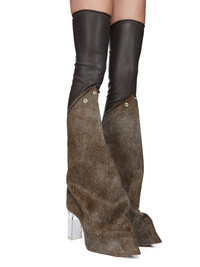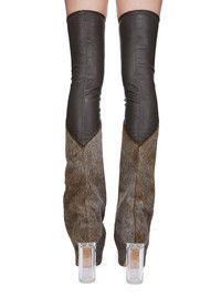 RICK OWENS FW25 CONCORDIANS RUNWAY TACO KISS IN WASHED INDIGO/CLEAR STRETCH LAMB LEATHER AND MELANGE UNSHAVED COW LEATHER THESE TACO KISS BOOTS ARE A DEFLATED VERSION OF OUR STRAYTUKAY COLLABORATION BOOTS. THEY ARE THIGH HIGH. THEY HAVE A TIGHT SOCK UPPER, JOINING TO A DIAGONAL SEAM LINE THAT SLOPES FROM MIDPOINT, OVER THE KNEE, DOWN TO THE CENTRE BACK CALF. THEY FEATURE A LEATHER UPPER THAT FLARES DOWN THE LOWER LEG, CURVING INTO THE BACK HEEL AND POINTING AT THE TOE. THEY HAVE A 12CM TRANSPARENT HEEL (4,5CM RISE) AND A THICK FRONT PLATFORM THIS IS A COMBINATION OF STRETCH LAMB LEATHER AND MELANGE UNSHAVED COW LEATHER THIS HEAVYWEIGHT LEATHER IS A HAIR-ON COWHIDE WITH NATURAL LENGTH COARSE HAIR THIS LEATHER IS TANNED IN THE VENETO AREA OF ITALY BY A TANNERY SPECIALIZED IN HAIR-ON COW LEATHER. BECAUSE THE HAIR IS NATURAL THERE CAN BE INCONSISTENCY IN THE LENGTH DIRECTION, TEXTURE AND COLOR THIS COLOR IS ACHIEVED BY BLEACHING THE NATURAL COW HAIR. VARIATIONS IN COLOR AND ESPECIALLY YELLOW SHADINGS CAN BE PRESENT DUE TO NATURAL URINE STAINS. THIS MEANS NO TWO PRODUCTS ARE EXACTLY ALIKE, GIVING EACH ITS INDIVIDUAL UNIQUENESS. THIS IS NOT TO BE CONSIDER DEFECT BUT IS THE VISUAL ASPECTS DESIRED SPECIFICALLY BY RICK OWENS THIS TANNERY IS LWG CERTIFIED WITH A SILVER RATING COLOR: WASHED INDIGO/CLEAR MATERIAL: UPPER PART 65% LAMB LEATHER + 34% COTTON + 1% SPANDEX LOWER PART 100% COW REAL FUR LINING 100% CALF LEATHERPLATFORM AT HEEL 12CM PLATFORM AT TOE 7,5CM RISE 4,5CM