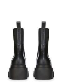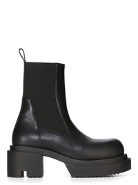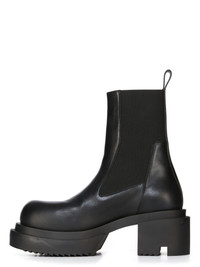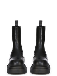 RICK OWENS FW24 PORTERVILLE BEATLE BOGUN IN BLACK WASHED CALF THESE BEATLE BOGUN BOOTS ARE ABOVE-ANKLE HEIGHT. THEY HAVE GEOMETRIC SIDE PANELS IN STRETCH ELASTIC, AN ANGULAR HEEL COUNTER WITH TOP STITCHING AND A BACK LOOP PULL TAB. THEY HAVE A ROUNDED TOE AND FEATURE A BOGUN RUBBER MEGA CREEPER SOLE WITH A TOOTHED SQUARE HEEL THIS MEDIUMWEIGHT COW LEATHER IS VEG TANNED AND FINISHED USING NATURAL WAXES. A FINAL WASH GIVES THIS LEATHER ITS SOFTNESS AND BRINGS OUT THE NATURAL GRAIN TEXTURE OF EACH SKIN. BECAUSE THIS SKIN IS NAKED, NOT FINISHED USING ANY PIGMENTS COVERING THE SKIN, NATURAL MARKINGS AND SHADINGS ARE VISIBLE WHICH MAKES EACH SKIN AND PRODUCT UNIQUE VEG TANNING MEANS ONLY VEGETAL AND NATURAL TANNINS WERE USED IN THE PROCESS OF TANNING AND PRESERVING THIS LEATHER - COLOR: BLACK - MATERIAL: UPPER 100% CALF LEATHER - LINING 100% CALF LEATHER - INSOLE 100% CALF LEATHER - SOLE 100% THERMOPLASTIC POLYURETHANE