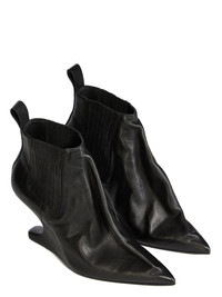 RICK OWENS FW25 CONCORDIANS RUNWAY ANKLE TACO IN BLACK WASHED CALF LEATHER THESE ANKLE TACO ARE JUST UNDER ANKLE HEIGHT. THEY FEATURE A LEATHER UPPER THAT FLARES OUT AT THE FRONT AND POINTS AT THE TOE. THEY FEATURE AN 8CM CANTILEVER HEEL, ELASTICIZED SIDE PANELS AND A BACK PULL TAB. THIS HEAVYWEIGHT COW LEATHER IS VEG TANNED AND FINISHED USING NATURAL WAXES. A FINAL WASH GIVES THIS LEATHER ITS SOFTNESS AND BRINGS OUT THE NATURAL GRAIN TEXTURE OF EACH SKIN. BECAUSE THIS SKIN IS NAKED, NOT FINISHED USING ANY PIGMENTS COVERING THE SKIN, NATURAL MARKINGS AND SHADINGS ARE VISIBLE WHICH MAKES EACH SKIN AND PRODUCT UNIQUE VEG TANNING MEANS ONLY VEGETAL AND NATURAL TANNINS WERE USED IN THE PROCESS OF TANNING AND PRESERVING THIS LEATHER THIS TANNERY IS LWG CERTIFIED WITH A SILVER RATING COLOR: BLACK MATERIAL: UPPER 100% CALF LEATHER LINING 100% CALF LEATHER INSOLE 100% CALF LEATHER HEEL HEIGHT 8CM