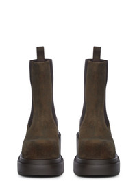 RICK OWENS FW25 CONCORDIANS RUNWAY BEATLE BOGUN IN WASHED INDIGO INDIGO SUEDE THESE BEATLE BOGUN BOOTS ARE ABOVE-ANKLE HEIGHT. THEY HAVE GEOMETRIC SIDE PANELS IN STRETCH ELASTIC, AN ANGULAR HEEL COUNTER WITH TOP STITCHING AND A BACK LOOP PULL TAB. THEY HAVE A ROUNDED TOE AND FEATURE A BOGUN RUBBER MEGA CREEPER SOLE WITH A TOOTHED SQUARE HEEL THIS MEDIUMWEIGHT CROSTA COW SUEDE LEATHER IS MATTE WITH A HAIRY SURFACE TEXTURE. IT IS DYED USING NATURAL INDIGO AND WASHED SEVERAL TIMES TO ACHIEVE ITS FINAL LOOK. IT HAS A NATURAL AND WAXY HAND FEEL ACHIEVED BY DRUMMING THE SKINS WITH WAX SINCE THE INDIGO USED TO DYE THIS LEATHER IS NATURAL, SHADINGS AND COLOR VARIATIONS WILL BE PRESENT. THE COLOR WILL CONTINUE TO EVOLVE AND CHANGE WITH WEAR AND AS IT GET EXPOSED TO LIGHT AND HUMIDITY THIS TANNERY IS LWG CERTIFIED WITH A GOLD RATING COLOR: WASHED INDIGO MATERIAL: 100% COW LEATHER SOLE AT HEEL 7CM SOLE AT TOE 4CM