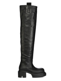 RICK OWENS FW25 CONCORDIANS RUNWAY WADER BOGUN IN BLACK WASHED CALF LEATHER THESE WADER BOGUN BOOTS ARE THIGH-HIGH. THEY HAVE ROUNDED TOES, A GEOMETRIC HEEL COUNTER THAT CONTINUES UP THE BACK CALF AND TWO PULL TABS IN WEBBING. THEY HAVE A BOGUN RUBBER MEGA CREEPER SOLE WITH A TOOTHED SQUARE HEEL THIS HEAVYWEIGHT COW LEATHER IS VEG TANNED AND FINISHED USING NATURAL WAXES. A FINAL WASH GIVES THIS LEATHER ITS SOFTNESS AND BRINGS OUT THE NATURAL GRAIN TEXTURE OF EACH SKIN. BECAUSE THIS SKIN IS NAKED, NOT FINISHED USING ANY PIGMENTS COVERING THE SKIN, NATURAL MARKINGS AND SHADINGS ARE VISIBLE WHICH MAKES EACH SKIN AND PRODUCT UNIQUE VEG TANNING MEANS ONLY VEGETAL AND NATURAL TANNINS WERE USED IN THE PROCESS OF TANNING AND PRESERVING THIS LEATHER THIS TANNERY IS LWG CERTIFIED WITH A SILVER RATING COLOR: BLACK MATERIAL: UPPER 100% CALF LEATHER LINING 100% CALF LEATHER INSOLE 100% CALF LEATHER PLATFORM AT HEEL 7CM PLATFORM AT TOE 4 CM
