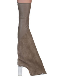 RICK OWENS SS25 HOLLYWOOD RUNWAY TACO KISS IN DUST/CLEAR STRETCH LAMB LEATHER AND VELOUR SUEDE THESE TACO KISS BOOTS ARE A DEFLATED VERSION OF OUR STRAYTUKAY COLLABORATION BOOTS. THEY ARE THIGH HIGH. THEY HAVE A TIGHT SOCK UPPER, JOINING TO A DIAGONAL SEAM LINE THAT SLOPES FROM MIDPOINT, OVER THE KNEE, DOWN TO THE CENTRE BACK CALF. THEY FEATURE A LEATHER UPPER THAT FLARES DOWN THE LOWER LEG, CURVING INTO THE BACK HEEL AND POINTING AT THE TOE. INSIDE THEY HAVE A 12CM CONCEALED WEDGE (6,5CM RISE) AND A THICK FRONT PLATFORM THIS IS A COMBINATION OF STRETCH LAMB LEATHER AND VELOUR SUEDE. THIS HEAVYWEIGHT CROSTA COW SUEDE LEATHER IS MATTE WITH A HAIRY SURFACE TEXTURE. IT HAS A NATURAL AND WAXY HAND FEEL. THIS TANNERY IS LWG CERTIFIED WITH A SILVER RATING THIS LEATHER IS MADE BY A SECOND GENERATION FAMILY OWNED TANNERY IN THE SOUTH OF FRANCE SPECIALIZING ONLY IN STRETCH LEATHER PRODUCTION. EACH SKIN IS STRETCHED OUT TO ITS LIMIT AND BONDED TO A COTTON AND LYCRA FABRIC BACKING. WHEN DYED, THE HEAT OF THE PROCESS ACTIVATES THE LYCRA ELASTIC FIBRES THAT SHRINK THE FABRIC AND WITH IT THE SKIN, BACK TO ITS ORIGINAL SIZE. THE LEATHER THEN EXITS THE PROCESS AS STRETCH. COLOR: DUST/CLEAR MATERIAL: UPPER PART UPPER 65% LAMB LEATHER + 34% COTTON + 1% SPANDEX LOWER PART UPPER 100% CALF LEATHER LINING 100% CALF LEATHER INSOLE 100% CALF LEATHER SOLE 100% COW LEATHER SOLE DETAIL 100% THERMOPLASTIC POLYURETHANE PLATFORM 7CM / HEEL 12CM