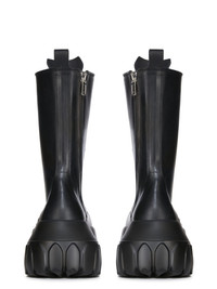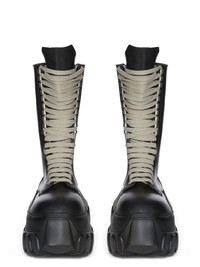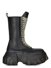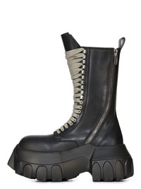 RICK OWENS FW24 PORTERVILLE ARMY MEGA TRACTOR IN BLACK/BLACK WASHED CALF THESE ARMY MEGA TRACTOR BOOTS ARE MID-CALF HEIGHT. THEY HAVE 9 EYELETS AND 10 HOOKS WITH LONG LACES THAT WRAP THE ANKLE. THEY HAVE ANGLED TOPSTITCHED PANELS, A CURVED ZIPPERS ON THE INNER AND OUTER LEGS FOR EASY FASTENING AND A PULL TAB AT BACK. THEY FEATURE A HIGH GEOMETRIC TONGUE AND HAVE A DOUBLE HEIGHT MEGA TRACTOR SOLE THIS MEDIUMWEIGHT COW LEATHER IS VEG TANNED AND FINISHED USING NATURAL WAXES. A FINAL WASH GIVES THIS LEATHER ITS SOFTNESS AND BRINGS OUT THE NATURAL GRAIN TEXTURE OF EACH SKIN. BECAUSE THIS SKIN IS NAKED, NOT FINISHED USING ANY PIGMENTS COVERING THE SKIN, NATURAL MARKINGS AND SHADINGS ARE VISIBLE WHICH MAKES EACH SKIN AND PRODUCT UNIQUE. VEG TANNING MEANS ONLY VEGETAL AND NATURAL TANNINS WERE USED IN THE PROCESS OF TANNING AND PRESERVING THIS LEATHER. - COLOR: BLACK/BLACK - MATERIAL: UPPER 100% CALF LEATHER - LINING 100% CALF LEATHER - INSOLE 100% CALF LEATHER - SOLE 100% E.V.A