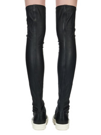 RICK OWENS FW25 CONCORDIANS HIGH STOCKING SNEAKS IN BLACK/MILK/MILK STRETCH LAMB LEATHER THESE HIGH STOCKING SNEAKS ARE ABOVE KNEE HEIGHT. THEY HAVE STRETCH LEATHER STOCKING UPPERS, DRAPING AROUND THE UPPER FOOT AND ANKLE, TOE CAPS AND SHARK-TOOTHED BUMPER SOLES. THIS STRETCH LAMB LEATHER HAS A SMALL GRAIN TEXTURE AND MATTE FINISH. THIS LEATHER IS MADE BY A SECOND GENERATION FAMILY OWNED TANNERY IN THE SOUTH OF FRANCE SPECIALIZING ONLY IN STRETCH LEATHER PRODUCTION. EACH SKIN IS STRETCHED OUT TO ITS LIMIT AND BONDED TO A COTTON AND LYCRA FABRIC BACKING. WHEN DYED, THE HEAT OF THE PROCESS ACTIVATES THE LYCRA ELASTIC FIBRES THAT SHRINK THE FABRIC AND WITH IT THE SKIN, BACK TO ITS ORIGINAL SIZE. THE LEATHER THEN EXITS THE PROCESS AS STRETCH. COLOR: BLACK/MILK/MILK MATERIAL: UPPER 65% LAMB LEATHER + 34% COTTON + 1% SPANDEX TOE 100% CALF LEATHER LINING 100% CALF LEATHER INSOLE 100% CALF LEATHER SOLE 100% THERMOPLASTIC RUBBER SOLE HEIGHT 3.5CM