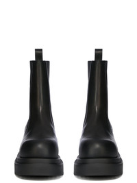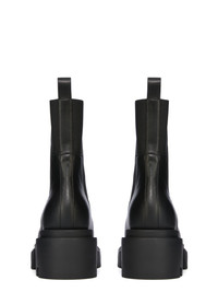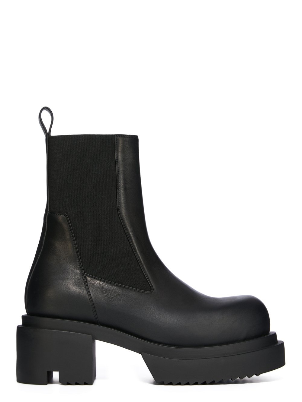RICK OWENS SS25 HOLLYWOOD BEATLE BOGUN IN BLACK/BLACK WASHED CALF THESE BEATLE BOGUN BOOTS ARE ABOVE-ANKLE HEIGHT. THEY HAVE GEOMETRIC SIDE PANELS IN STRETCH ELASTIC, AN ANGULAR HEEL COUNTER WITH TOP STITCHING, AND A BACK LOOP PULL TAB. THEY HAVE A ROUNDED TOE AND FEATURE A BOGUN RUBBER MEGA CREEPER SOLE WITH A TOOTHED SQUARE HEEL THIS MEDIUMWEIGHT COW LEATHER IS VEG TANNED AND FINISHED USING NATURAL WAXES. A FINAL WASH GIVES THIS LEATHER ITS SOFTNESS AND BRINGS OUT THE NATURAL GRAIN TEXTURE OF EACH SKIN. BECAUSE THIS SKIN IS NAKED, NOT FINISHED USING ANY PIGMENTS COVERING THE SKIN, NATURAL MARKINGS AND SHADINGS ARE VISIBLE WHICH MAKES EACH SKIN AND PRODUCT UNIQUE. VEG TANNING MEANS ONLY VEGETAL AND NATURAL TANNINS WERE USED IN THE PROCESS OF TANNING AND PRESERVING THIS LEATHER. THIS TANNERY IS LWG CERTIFIED WITH A SILVER RATING COLOR: BLACK/BLACK MATERIAL: UPPER 100% CALF LEATHER LINING 100% CALF LEATHER INSOLE 100% CALF LEATHER SOLE 100% THERMOPLASTIC POLYURETHANE