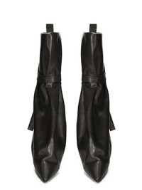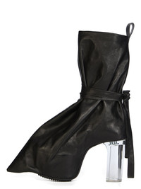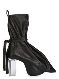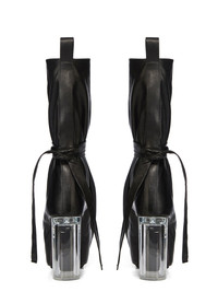 RICK OWENS FW25 CONCORDIANS RUNWAY TIED TACO KISS IN BLACK/CLEAR WASHED CALF LEATHER THESE TIED TACO KISS ARE A SHORTER, DEFLATED, VERSION OF OUR STRAYTUKAY COLLABORATION BOOTS. THEY ARE ABOVE ANKLE HEIGHT. THEY FEATURE A LEATHER UPPER THAT FLARES DOWN FROM ABOVE ANKLE AND IS TIED WITH LEATHER STRAPS AROUND THE ANKLE, CREATING A SLIGHT DRAPE. IT THEN CURVES INTO THE BACK HEEL AND POINTS AT THE TOE. INSIDE THEY HAVE A 12CM CONCEALED WEDGE (4,5CM RISE) AND A THICK FRONT PLATFORM (7,5CM) THIS HEAVYWEIGHT COW LEATHER IS VEG TANNED AND FINISHED USING NATURAL WAXES. A FINAL WASH GIVES THIS LEATHER ITS SOFTNESS AND BRINGS OUT THE NATURAL GRAIN TEXTURE OF EACH SKIN. BECAUSE THIS SKIN IS NAKED, NOT FINISHED USING ANY PIGMENTS COVERING THE SKIN, NATURAL MARKINGS AND SHADINGS ARE VISIBLE WHICH MAKES EACH SKIN AND PRODUCT UNIQUE VEG TANNING MEANS ONLY VEGETAL AND NATURAL TANNINS WERE USED IN THE PROCESS OF TANNING AND PRESERVING THIS LEATHER THIS TANNERY IS LWG CERTIFIED WITH A SILVER RATING COLOR: BLACK/CLEAR MATERIAL: UPPER 100% CALF LEATHER LINING 100% CALF LEATHER INSOLE 100% CALF LEATHER PLATFORM AT HEEL 12CM PLATFORM AT TOE 7,5CM RISE 4,5CM