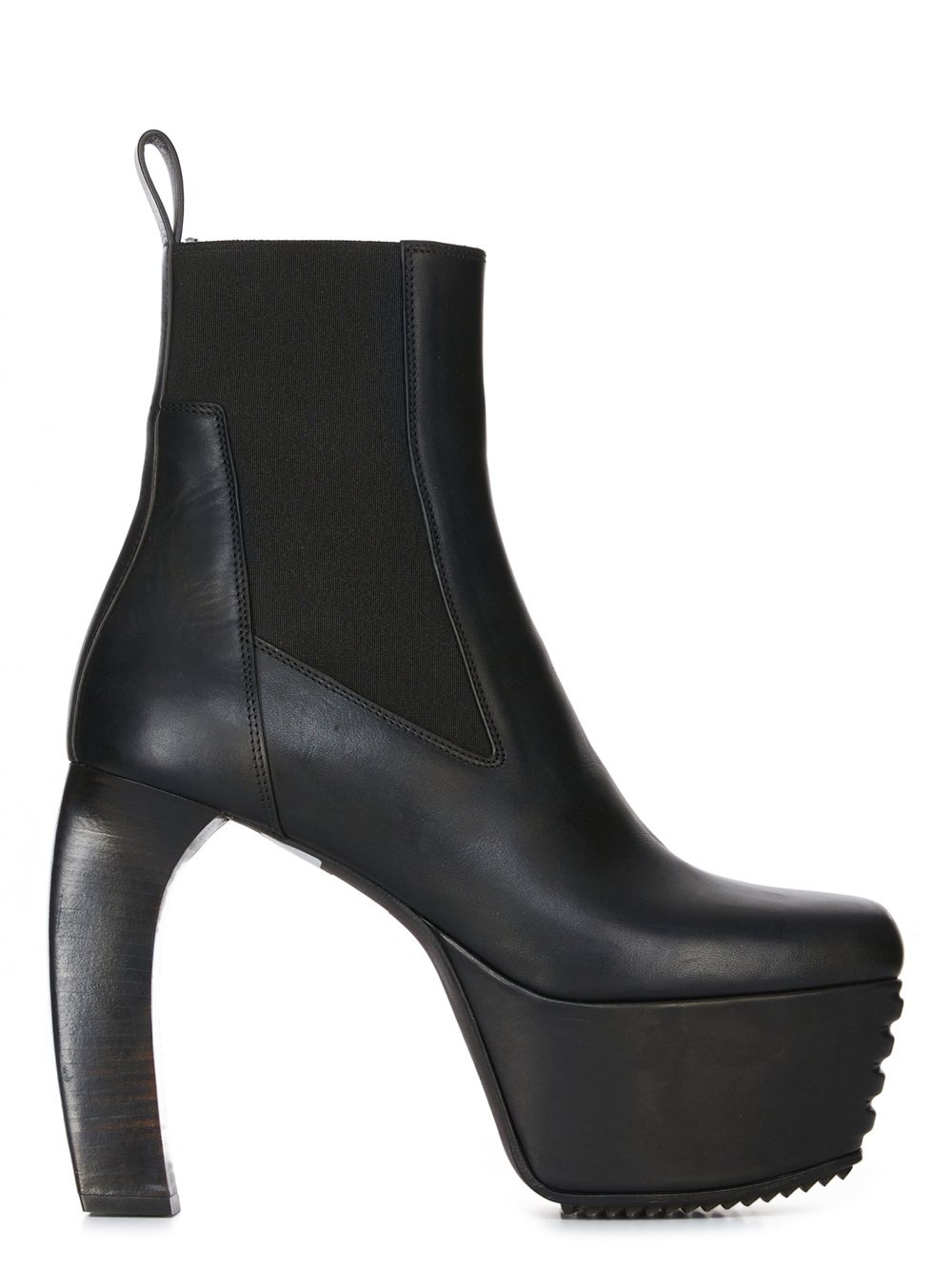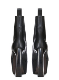 RICK OWENS FW24 PORTERVILLE BEATLE BANANA IN BLACK WASHED CALF THESE BEATLE BANANAS ARE ABOVE-ANKLE HEIGHT. THEY HAVE GEOMETRIC SIDE PANELS IN STRETCH ELASTIC, AN ANGULAR HEEL COUNTER WITH TOP STITCHING AND A BACK LOOP PULL TAB. THEY FEATURE A STACKED LEATHER 12,5CM CURVED BANANA HEEL (7CM RISE) AND A THICK COVERED FRONT PLATFORM THIS MEDIUMWEIGHT COW LEATHER IS VEG TANNED AND FINISHED USING NATURAL WAXES. A FINAL WASH GIVES THIS LEATHER ITS SOFTNESS AND BRINGS OUT THE NATURAL GRAIN TEXTURE OF EACH SKIN. BECAUSE THIS SKIN IS NAKED, NOT FINISHED USING ANY PIGMENTS COVERING THE SKIN, NATURAL MARKINGS AND SHADINGS ARE VISIBLE WHICH MAKES EACH SKIN AND PRODUCT UNIQUE. VEG TANNING MEANS ONLY VEGETAL AND NATURAL TANNINS WERE USED IN THE PROCESS OF TANNING AND PRESERVING THIS LEATHER. - COLOR: BLACK - MATERIAL: UPPER 100% CALF LEATHER - LINING 100% CALF LEATHER - INSOLE 100% CALF LEATHER - SOLE 100% COW LEATHER - SOLE DETAIL 100% THERMOPLASTIC POLYURETHANE