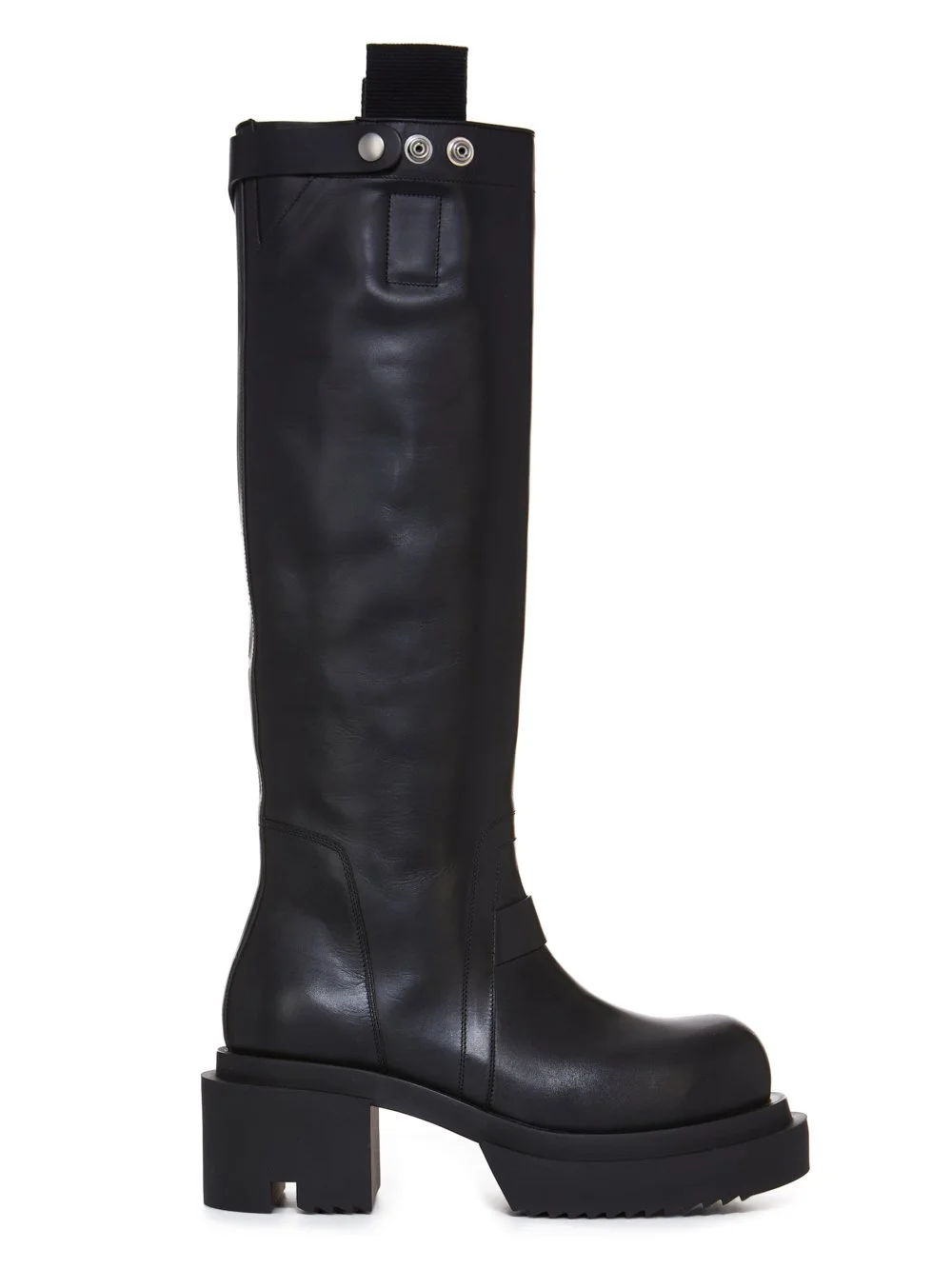 RICK OWENS FW25 CONCORDIANS KNEE PULL ON BOGUN BOOTS IN BLACK WASHED CALF LEATHER THESE PULL ON BOGUN BOOTS ARE BELOW-KNEE HEIGHT. THEY HAVE ROUNDED TOES, SEAMS WITH TOPSTITCHING OVER THE BRIDGE OF THE FOOT AND HEEL COUNTER AND A FLAT STRAP DETAIL ACROSS THE FRONT ANKLE. THEY FEATURE A TAB ON THE TOP LEG WHICH FASTENS WITH SNAPS AND HAS TWO PULL TABS IN WEBBING. THEY HAVE A BOGUN RUBBER MEGA CREEPER SOLE WITH A TOOTHED SQUARE HEEL THIS MEDIUMWEIGHT COW LEATHER IS VEG TANNED AND FINISHED USING NATURAL WAXES. A FINAL WASH GIVES THIS LEATHER ITS SOFTNESS AND BRINGS OUT THE NATURAL GRAIN TEXTURE OF EACH SKIN. BECAUSE THIS SKIN IS NAKED, NOT FINISHED USING ANY PIGMENTS COVERING THE SKIN, NATURAL MARKINGS AND SHADINGS ARE VISIBLE WHICH MAKES EACH SKIN AND PRODUCT UNIQUE VEG TANNING MEANS ONLY VEGETAL AND NATURAL TANNINS WERE USED IN THE PROCESS OF TANNING AND PRESERVING THIS LEATHER THIS TANNERY IS LWG CERTIFIED WITH A SILVER RATING COLOR: BLACK MATERIAL: UPPER 100% CALF LEATHER LINING 100% CALF LEATHER INSOLE 100% CALF LEATHER SOLE 100% THERMOPLASTIC POLYURETHANE SOLE AT HEEL 6CM - SOLE AT TOE 3CM