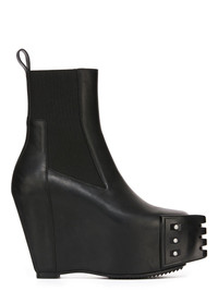 RICK OWENS FW24 PORTERVILLE RUNWAY GRILLED WEDGE BEATLE IN BLACK WASHED CALF THESE GRILLED WEDGE BEATLES ARE ABOVE-ANKLE HEIGHT. THEY HAVE ELASTIC SIDE PANELS, AN ANGLED HEEL COUNTER WITH TOPSTITCHING, AND A BACK PULL-TAB. THEY FEATURE A 12CM CONCEALED WEDGE (6,5CM RISE), A THICK, COVERED FRONT PLATFORM AND A BEVELLED GRILL, SECURED WITH SILVER RIVETS THIS MEDIUMWEIGHT CALF LEATHER IS VEG TANNED AND FINISHED USING NATURAL WAXES. A FINAL WASH GIVES THIS LEATHER ITS SOFTNESS AND BRINGS OUT THE NATURAL GRAIN TEXTURE OF EACH SKIN. BECAUSE THIS SKIN IS NAKED, NOT FINISHED USING ANY PIGMENTS COVERING THE SKIN, NATURAL MARKINGS AND SHADINGS ARE VISIBLE WHICH MAKES EACH SKIN AND PRODUCT UNIQUE. VEG TANNING MEANS ONLY VEGETAL AND NATURAL TANNINS WERE USED IN THE PROCESS OF TANNING AND PRESERVING THIS LEATHER. - COLOR: BLACK - MATERIAL: UPPER 100% CALF LEATHER - LINING 100% CALF LEATHER - INSOLE 100% CALF LEATHER - SOLE 100% COW LEATHER - SOLE DETAIL 100% THERMOPLASTIC POLYURETHANE