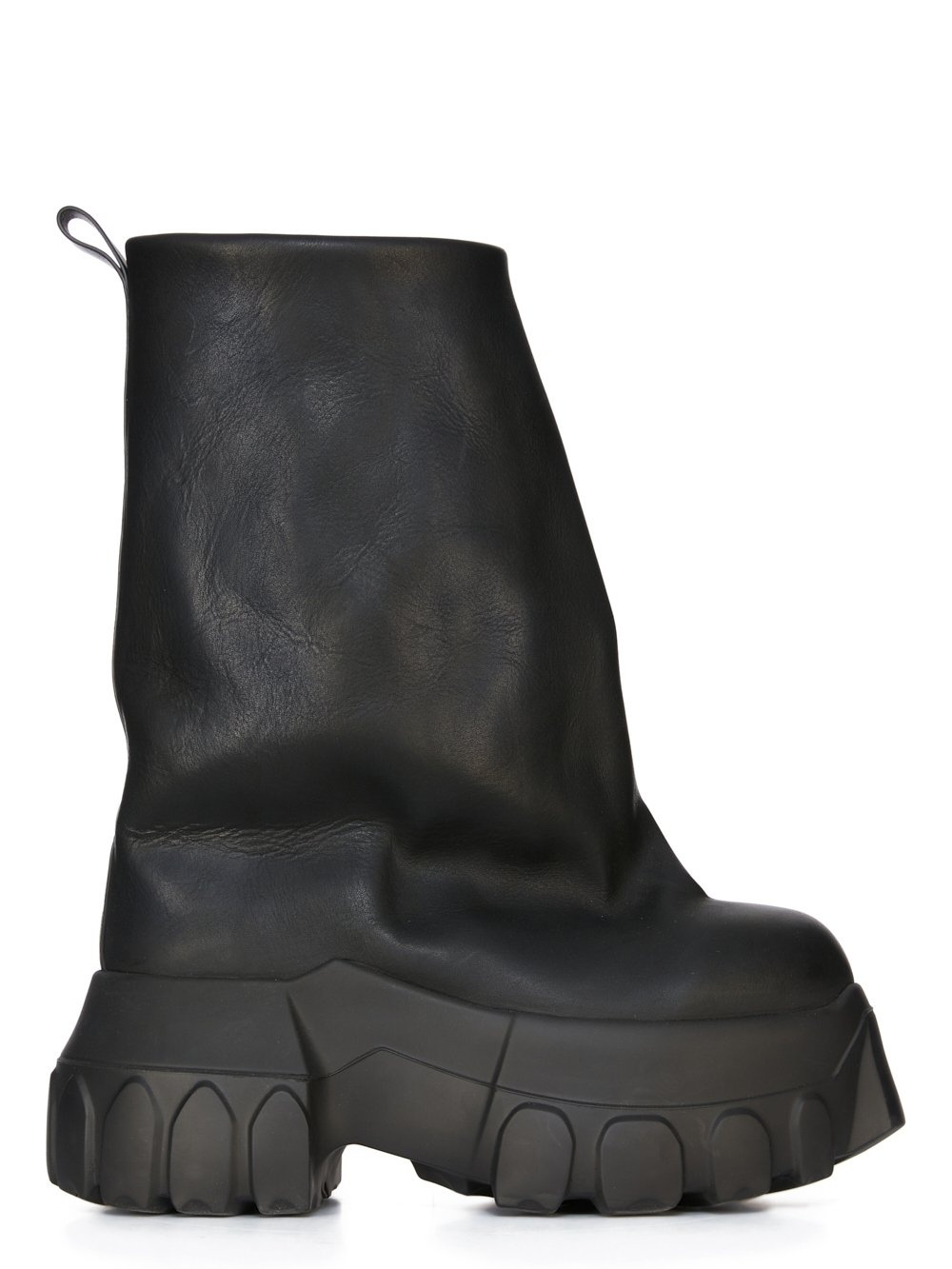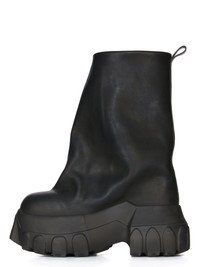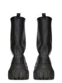 RICK OWENS FW24 PORTERVILLE FLARED MEGA TRACTOR IN BLACK/BLACK WASHED CALF THESE FLARED MEGA TRACTOR BOOTS ARE MID-CALF HEIGHT. THEY HAVE A PULL ON BOOT UPPER WITH BACK TAB. THEY FLARE OUTWARDS, WIDENING OVER THE FOOT, CREATING A VOLUME FROM CALF TO TOE. THEY FEATURE A DOUBLE HEIGHT MEGA TRACTOR SOLE THIS MEDIUMWEIGHT COW LEATHER IS VEG TANNED AND FINISHED USING NATURAL WAXES. A FINAL WASH GIVES THIS LEATHER ITS SOFTNESS AND BRINGS OUT THE NATURAL GRAIN TEXTURE OF EACH SKIN. BECAUSE THIS SKIN IS NAKED, NOT FINISHED USING ANY PIGMENTS COVERING THE SKIN, NATURAL MARKINGS AND SHADINGS ARE VISIBLE WHICH MAKES EACH SKIN AND PRODUCT UNIQUE. VEG TANNING MEANS ONLY VEGETAL AND NATURAL TANNINS WERE USED IN THE PROCESS OF TANNING AND PRESERVING THIS LEATHER. - COLOR: BLACK/BLACK - MATERIAL: UPPER 100% CALF LEATHER - LINING 100% CALF LEATHER - INSOLE 100% CALF LEATHER - SOLE 100% E.V.A
