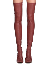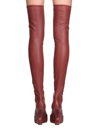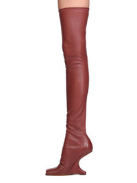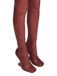RICK OWENS FW25 CONCORDIANS CANTILEVER 11 THIGH HIGH IN ROSEWOOD STRETCH LAMB LEATHER THIS CANTILEVER 11 THIGH HIGH IS A MID-THIGH HEIGHT STRETCH SOCK BOOT WITH A SQUARE TOE AND A HIGH CANTILEVERED HEEL THIS STRETCH LAMB LEATHER HAS A SMALL GRAIN TEXTURE AND MATTE FINISH THIS LEATHER IS MADE BY A SECOND GENERATION FAMILY OWNED TANNERY IN THE SOUTH OF FRANCE SPECIALIZING ONLY IN STRETCH LEATHER PRODUCTION. EACH SKIN IS STRETCHED OUT TO ITS LIMIT AND BONDED TO A COTTON AND LYCRA FABRIC BACKING. WHEN DYED, THE HEAT OF THE PROCESS ACTIVATES THE LYCRA ELASTIC FIBRES THAT SHRINK THE FABRIC AND WITH IT THE SKIN, BACK TO ITS ORIGINAL SIZE. THE LEATHER THEN EXITS THE PROCESS AS STRETCH COLOR: ROSEWOOD MATERIAL: UPPER 65% LAMB LEATHER + 34% COTTON + 1% SPANDEX LINING 100% GOAT LEATHER INSOLE 100% CALF LEATHER SOLE 100% COW LEATHER SOLE DETAIL 100% THERMOPLASTIC POLYURETHANE HEEL HEIGHT 11CM