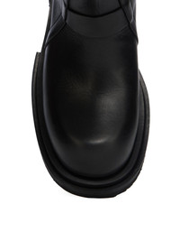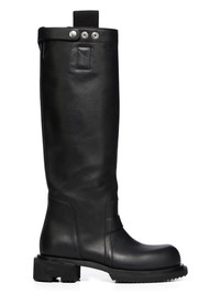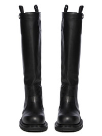 RICK OWENS SS26 TEMPLE KNEE PULL ON GABE IN BLACK WASHED CALF LEATHER THESE KNEE PULL GABE ARE BELOW-KNEE HEIGHT. THEY HAVE ROUNDED TOES, SEAMS WITH TOPSTITCHING OVER THE BRIDGE OF THE FOOT AND HEEL COUNTER AND A FLAT STRAP DETAIL ACROSS THE FRONT ANKLE. THEY FEATURE A TAB ON THE TOP LEG WHICH FASTENS WITH SNAPS AND HAS TWO PULL TABS IN WEBBING. THEY HAVE A LOW RUBBER CREEPER SOLE WITH A TOOTHED SQUARE HEEL THIS MEDIUMWEIGHT CALF LEATHER IS VEG TANNED AND FINISHED USING NATURAL WAXES. A FINAL WASH GIVES THIS LEATHER ITS SOFTNESS AND BRINGS OUT THE NATURAL GRAIN TEXTURE OF EACH SKIN. BECAUSE THIS SKIN IS NAKED, NOT FINISHED USING ANY PIGMENTS COVERING THE SKIN, NATURAL MARKINGS AND SHADINGS ARE VISIBLE WHICH MAKES EACH SKIN AND PRODUCT UNIQUE VEG TANNING MEANS ONLY VEGETAL AND NATURAL TANNINS WERE USED IN THE PROCESS OF TANNING AND PRESERVING THIS LEATHER THIS TANNERY IS LWG CERTIFIED WITH A SILVER RATING COLOR: BLACK MATERIAL:UPPER 100% CALF LEATHER LINING 100% CALF LEATHER INSOLE 100% CALF LEATHER INTERSOLE 100% COW LEATHER SOLE 100% E.V.A SOLE AT TOE 2CM AT HEEL 4CM