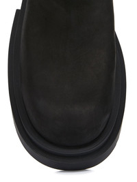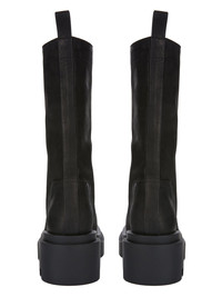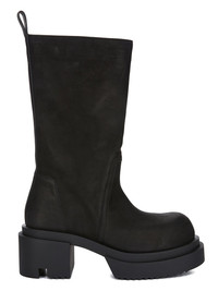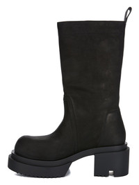 RICK OWENS FW25 CONCORDIANS CALF PULL ON BOGUN IN BLACK NUBUCK THESE CALF PULL ON BOGUN BOOTS ARE MID CALF HEIGHT. THEY PULL ON BOOT UPPER, A TOPSTITCHED SEAM ARCING OVER THE FRONT FOOT AND A STITCHED HEEL COUNTER. IT HAS A BACK PULL TAB AND A ROUNDED TOE. THEY FEATURE A BOGUN RUBBER MEGA CREEPER SOLE WITH A TOOTHED SQUARE HEEL THIS HEAVYWEIGHT BULL LEATHER HAS A BRUSHED NUBUCK FINISH AND WAXY HANDFEEL. BECAUSE THIS SKIN IS NAKED, NOT FINISHED USING ANY PIGMENTS COVERING THE SKIN, NATURAL MARKINGS AND SHADINGS ARE VISIBLE WHICH MAKES EACH SKIN AND PRODUCT UNIQUE THIS TANNERY IS LWG CERTIFIED WITH A SILVER RATING COLOR: BLACK MATERIAL: UPPER 100% CALF LEATHER LINING 100% CALF LEATHER INSOLE 100% CALF LEATHER SOLE 100% THERMOPLASTIC POLYURETHANE SOLE AT HEEL 6CM - SOLE AT TOE 3CM