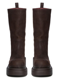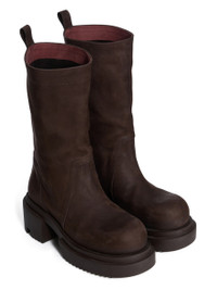 RICK OWENS FW25 CONCORDIANS CALF PULL ON BOGUN IN BROWN NUBUCK THESE CALF PULL ON BOGUN BOOTS ARE MID CALF HEIGHT. THEY PULL ON BOOT UPPER, A TOPSTITCHED SEAM ARCING OVER THE FRONT FOOT AND A STITCHED HEEL COUNTER (HEEL 6CM, TOE 3CM). IT HAS A BACK PULL TAB AND A ROUNDED TOE. THEY FEATURE A BOGUN RUBBER MEGA CREEPER SOLE WITH A TOOTHED SQUARE HEEL THIS HEAVYWEIGHT BULL LEATHER HAS A BRUSHED NUBUCK FINISH AND WAXY HANDFEEL. BECAUSE THIS SKIN IS NAKED, NOT FINISHED USING ANY PIGMENTS COVERING THE SKIN, NATURAL MARKINGS AND SHADINGS ARE VISIBLE WHICH MAKES EACH SKIN AND PRODUCT UNIQUE THIS TANNERY IS LWG CERTIFIED WITH A SILVER RATING COLOR: BROWN MATERIAL: UPPER 100% CALF LEATHER LINING 100% CALF LEATHER INSOLE 100% CALF LEATHER SOLE 100% THERMOPLASTIC POLYURETHANE SOLE AT HEEL 6CM - SOLE AT TOE 3CM
