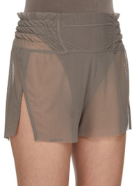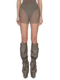 RICK OWENS SS26 TEMPLE BOXING SHORT IN DUST STRETCH TULLE THIS BOXING SHORT IS HIGH-ON-THE-THIGH LENGTH. THEY HAVE AN ELASTICIZED "BOXER" WAIST AND BEVELED SIDE SLITS. THIS VERSION IS TRANSPARENT AND CAN BE WORN LAYERED WITH OTHER GARMENTS IN THE TULLE SECTION OF THIS COLLECTION. THIS LIGHTWEIGHT AND SHEER NYLON STRETCH TULLE HAS A SOFT HANDFEEL. THIS FABRIC IS MADE USING GRS CERTIFIED RECYCLED POLYAMIDE WHICH ENSURES A REDUCTION IN WATER CONSUMPTION, EMISSIONS AND HAZARDOUS WASTE, LESSENING THE DEPENDENCE ON NON-RENEWABLE RESOURCES. COLOR: DUST MATERIAL: 93% NYLON + 7% ELASTANE MODEL IS 181CM TALL MODEL WEARS SIZE 40