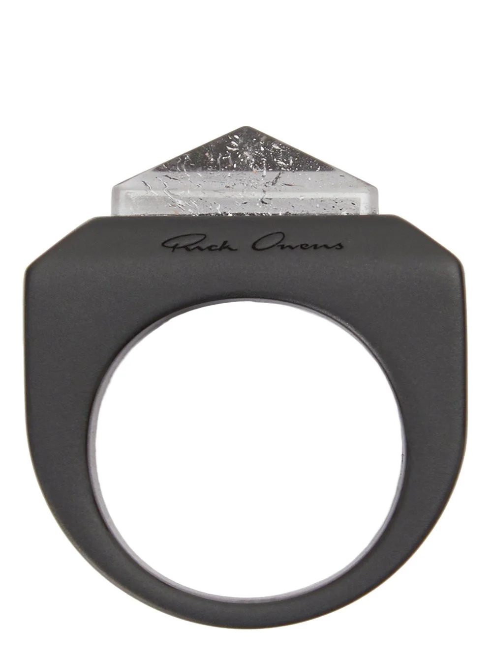 RICK OWENS CRYSTAL PYRAMID BRACELET IN ALUMINIUM AND ROCK CRYSTAL THIS CRYSTAL PYRAMID BRACELET IS A LARGE RIGID METAL CUFF WITH BEVELED EDGES. IT IS ORNAMENTED WITH A LARGE PYRAMID SHAPED ROCK CRYSTAL. IT HAS THE RICK OWENS LOGO ENGRAVED IN THE SIDE FACE. THESE JEWELLERY PIECES ARE CRAFTED WITH THE INDIVIDUAL HANDWORK OF THE ARTISAN, MAKING EACH PIECE UNIQUE. COLOR: BLACK MATERIAL: 100% TIN AND ROCK CRYSTAL