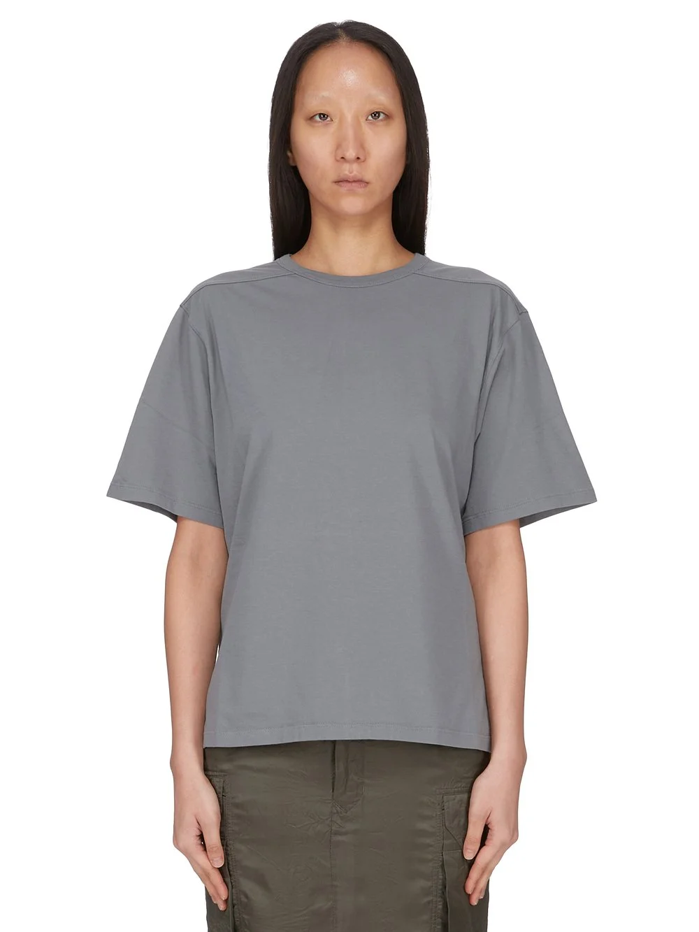 RICK OWENS FW25 CONCORDIANS BRAD T IN WASHED INDIGO CLASSIC COTTON JERSEY THIS BRAD T IS BELOW HIP LENGTH WITH SHORT SLEEVES. IT HAS A CLASSIC SQUARE CUT, A RIBBED ROUND NECK, AND LEVEL SHOULDER SEAMS. IT FEATURES THE SIGNATURE SINGLE SEAM RUNNING DOWN THE CENTRE BACK SPINE WE STRIVE TO KEEP OUR PRODUCTION AS LOCAL AS POSSIBLE. THE FULL MANUFACTURING CYCLE OF THIS PRODUCT, FROM THE MATERIAL KNITTING TO SEWING AND FINISHING, WAS UNDERTAKEN CLOSE TO OUR HOME BASE IN CONCORDIA, ITALY COLOR: WASHED INDIGO MATERIAL: 100% COTTON MODEL IS 181CM TALL MODEL WEAR SIZE 38