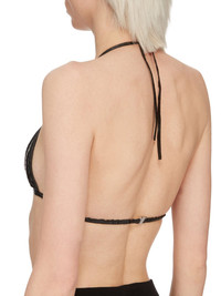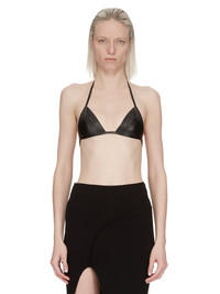 RICK OWENS SS24 LIDO BRA IN BLACK RADIATED RATSNAKE THIS BRA IS A TRIANGLE SHAPE WITH A THIN STRAP THAT RUNS AROUND THE BACK AND FASTENS WITH A HOOK CLIP AND TIES, HALTER NECK STYLE, IN THE BACK NECK. THIS ITEM IS MADE FROM AN EXOTIC LEATHER, PLEASE CHECK FOR ANY LOCAL IMPORT RESTRICTIONS OR TAXES FOR YOUR COUNTRYELAPHE RADIATA OR RADIATED RATSNAKE SNAKE IS NATIVE TO SOUTHEAST ASIA, INDIA AND NEPAL. OUR SNAKES ARE CAPTURED IN THE WILD IN MALAYSIA AND INDONESIA, STITCHED TOGETHER INTO PANELS AND DYED. THE SCALE TEXTURE IS NATURAL TO THE ANIMAL, THEREFORE THERE WILL BE VARIATIONS IN THE PATTERN MAKING EACH SKIN AND PRODUCT UNIQUE. RATSNAKE IS COMMON IN ITS NATURAL HABITAT AND NOT PROTECTED BY CITES. - COLOR: BLACK - MATERIAL: 100% SNAKE LEATHER - LINING 100% CUPRO - MODEL IS 181CM TALL - MODEL WEARS SIZE 40
