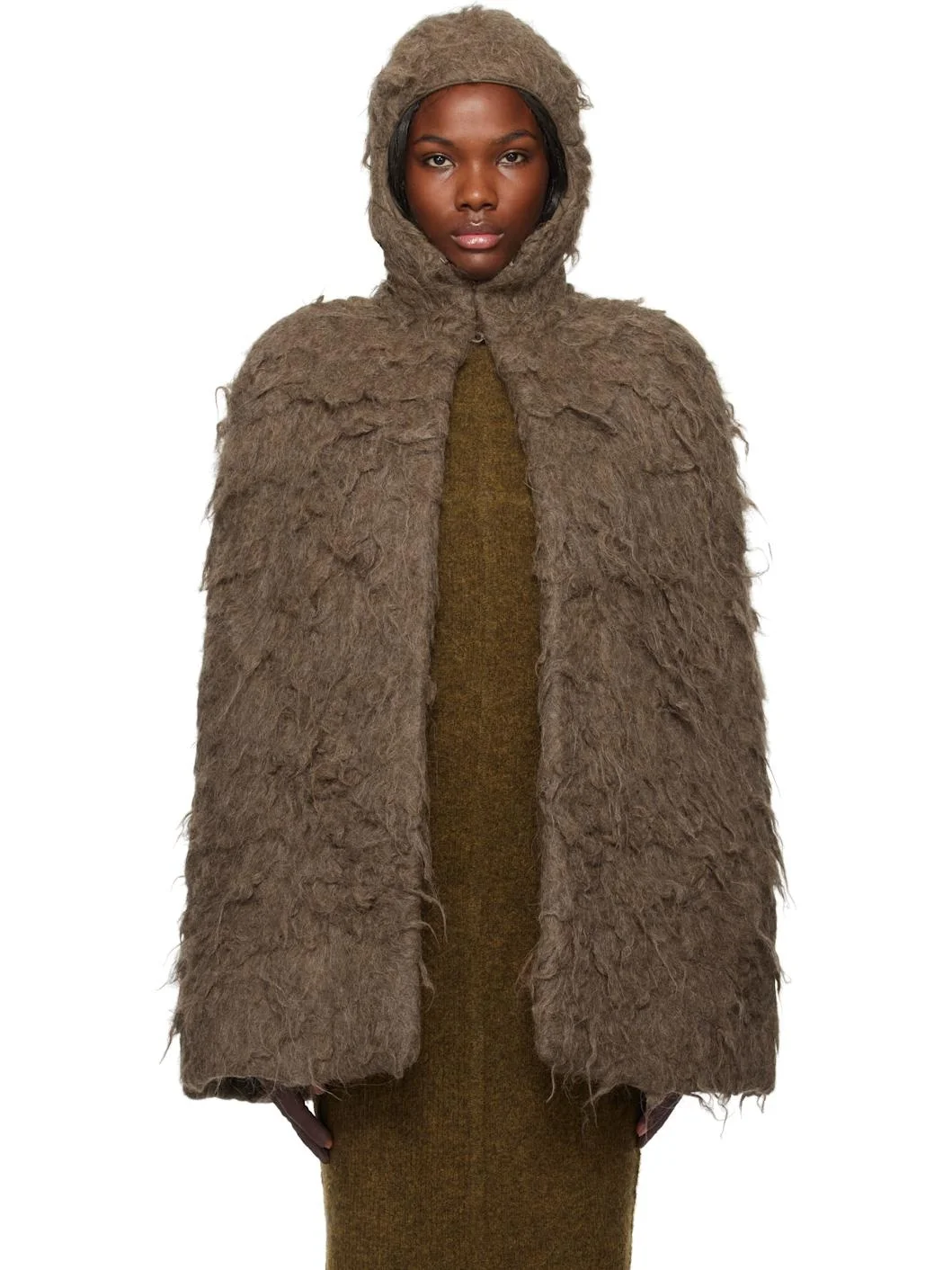 Brushed alpaca- and silk-blend felt cape-style jacket. · Hood and hook-eye fastening at stand collar · Open front · Zip pockets at interior · Full stretch cotton canvas and cupro satin lining Supplier color: Fawn Body: 90% alpaca, 10% silk. Lining 1: 97% cotton, 3% elastane. Lining 2: 100% cupro. Made in Italy 242232F063018